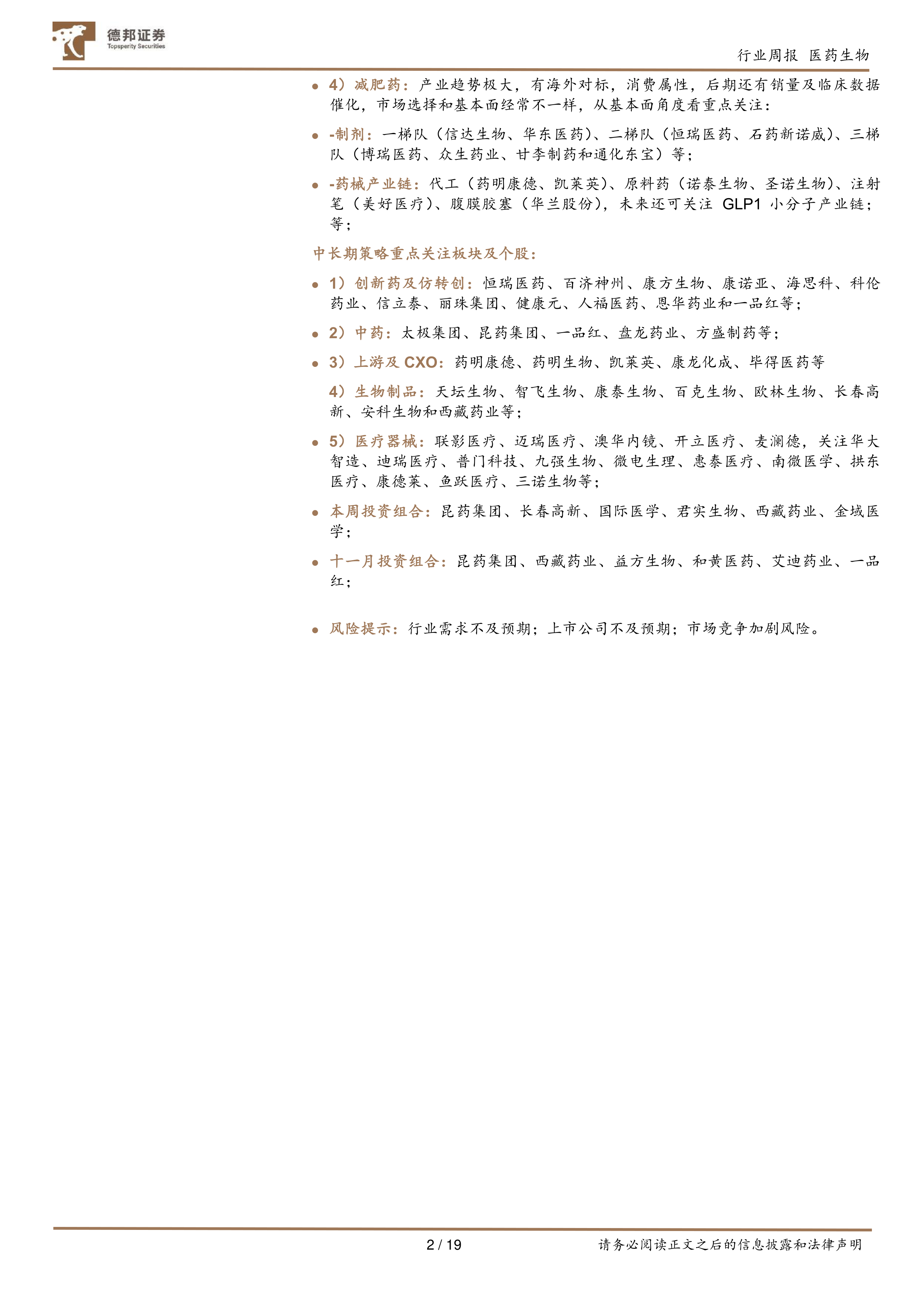 1)创新药:医保谈判续约启动、FDA批准多款制剂出海以及预期宏观流动性变化等系列催化,重点关注:百济神州、荣昌生物、百奥泰、君实生物、信达生物、迈威生物、和黄医药、益方生物等;