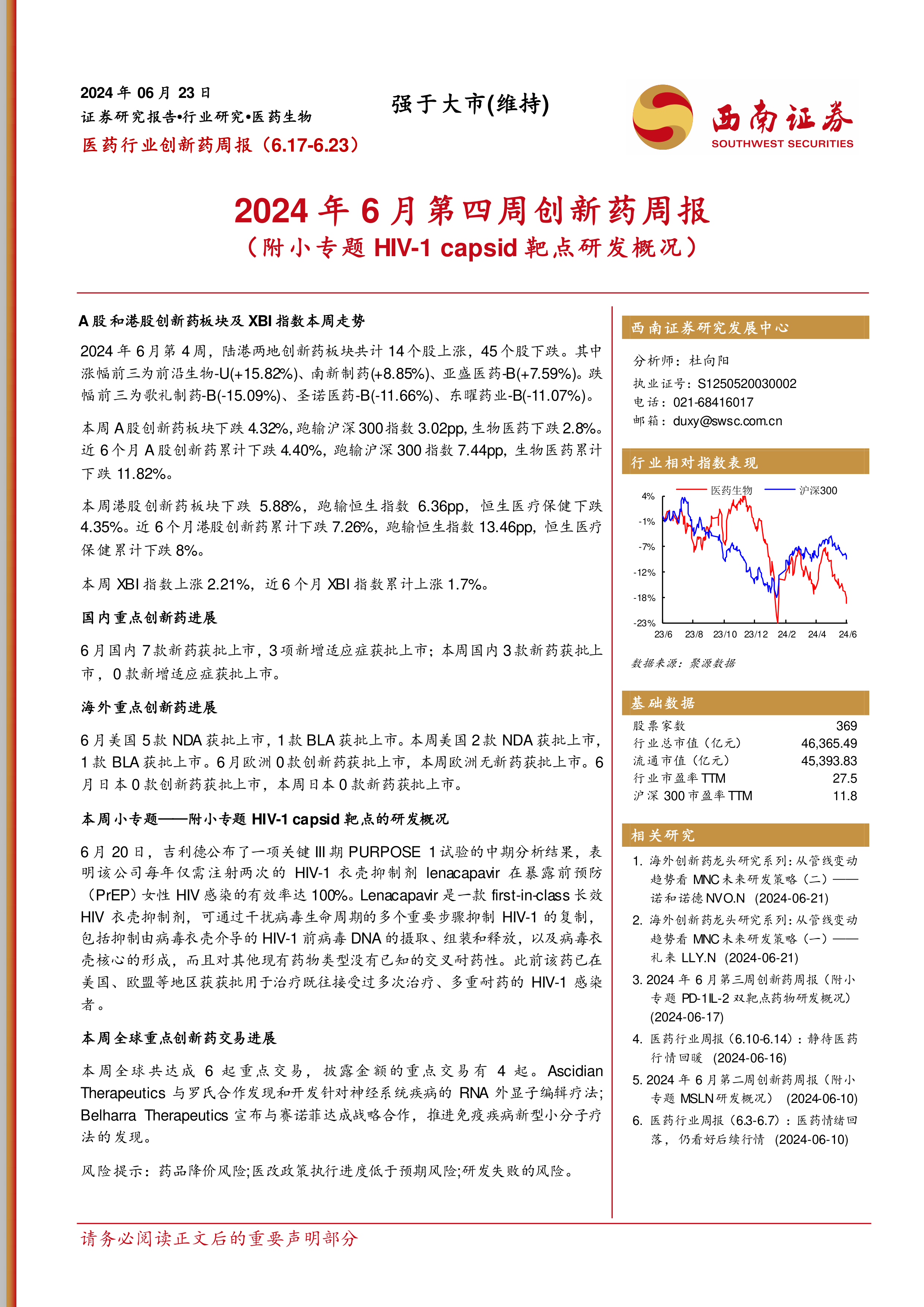 2024年6月第四周创新药周报(附小专题HIV-1capsid靶点研发概况)
