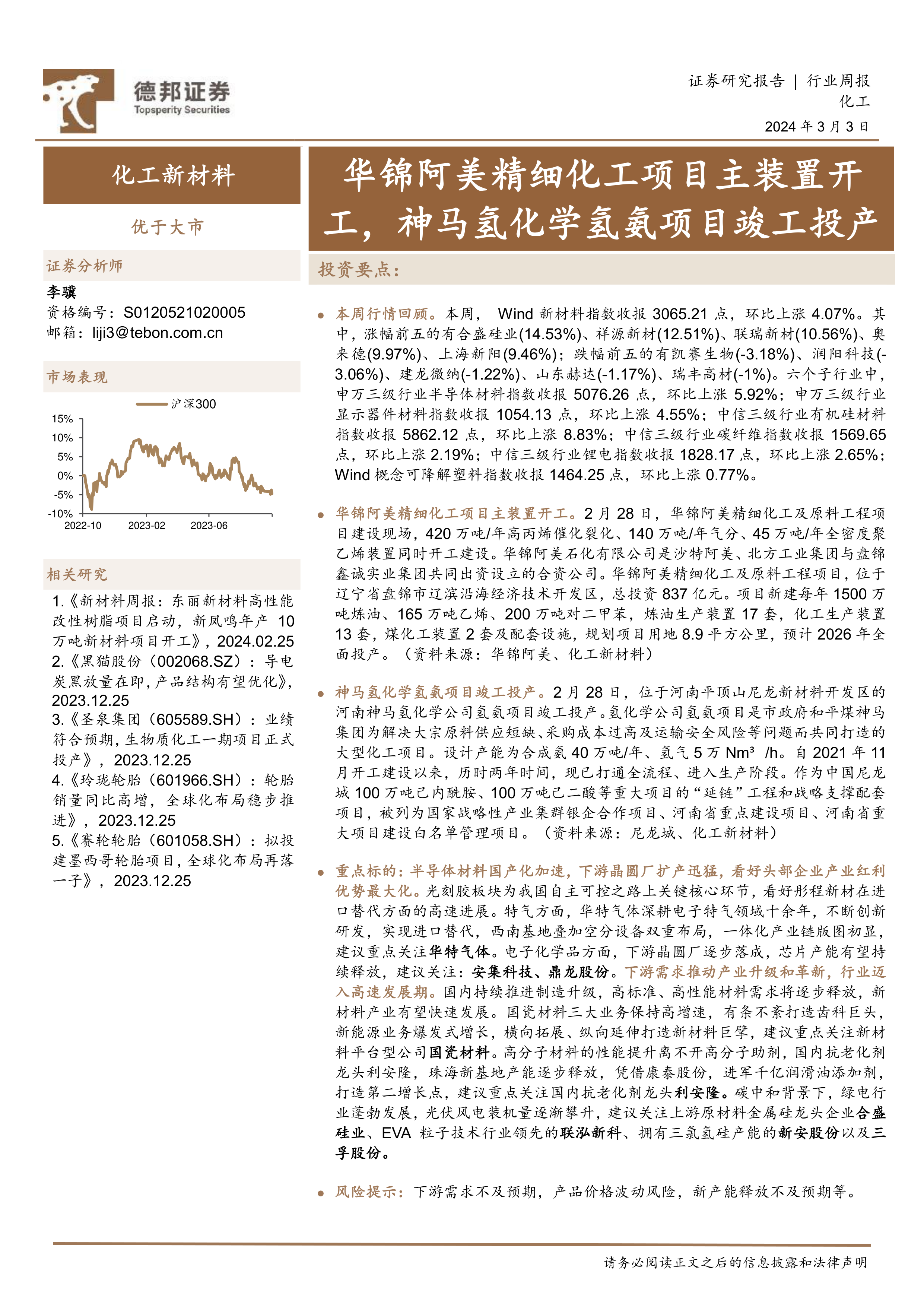 化工新材料行业周报:华锦阿美精细化工项目主装置开工,神马氢化学氢氨项目竣工投产