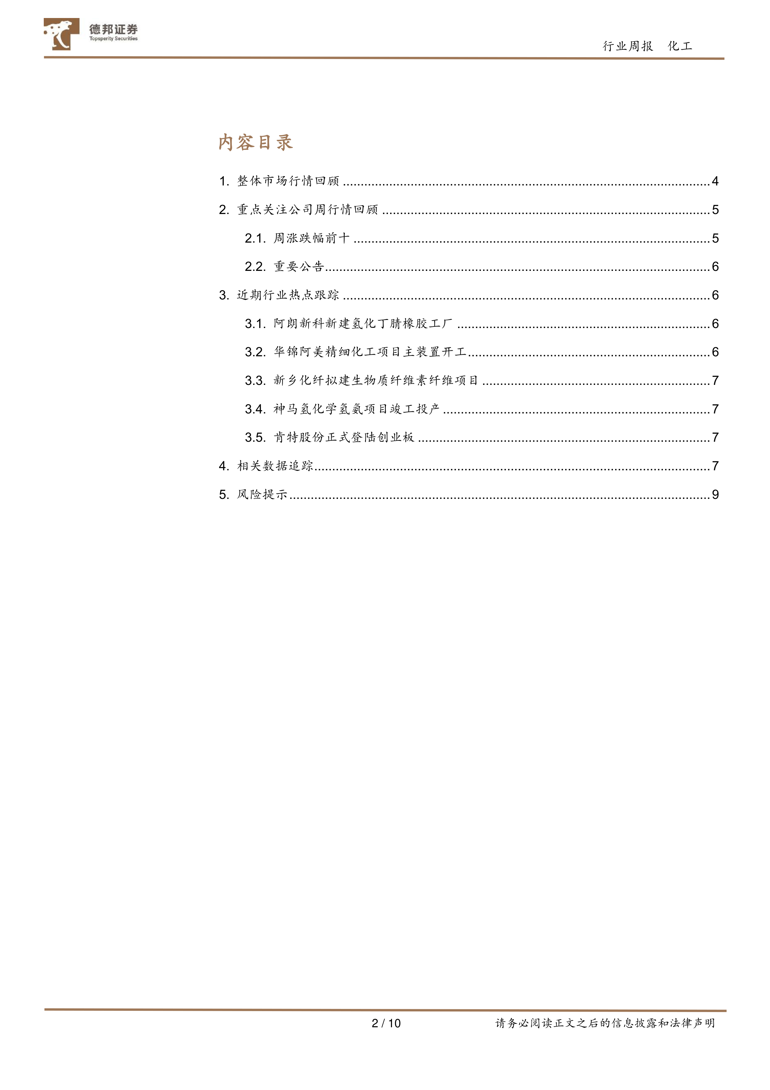 本周化工新材料行业整体表现强劲,多个子行业指数涨幅显著,主要得益于华锦阿美精细化工项目和神马氢化学氢氨项目等重大项目的推进。 报告对重点公司周行情、行业热点事件以及相关数据进行了深入分析,并对半导体材料、特气、电子化学品等细分领域进行了展望,认为国产化加速和下游需求增长将驱动行业持续发展。 然而,投资者仍需关注下游需求不及预期、产品价格波动以及新产能释放不及预期等风险。 本报告为投资者提供了对化工新材料行业近期市场行情的全面分析,以及对未来发展趋势的专业判断,但并非投资建议,投资者需谨慎决策。