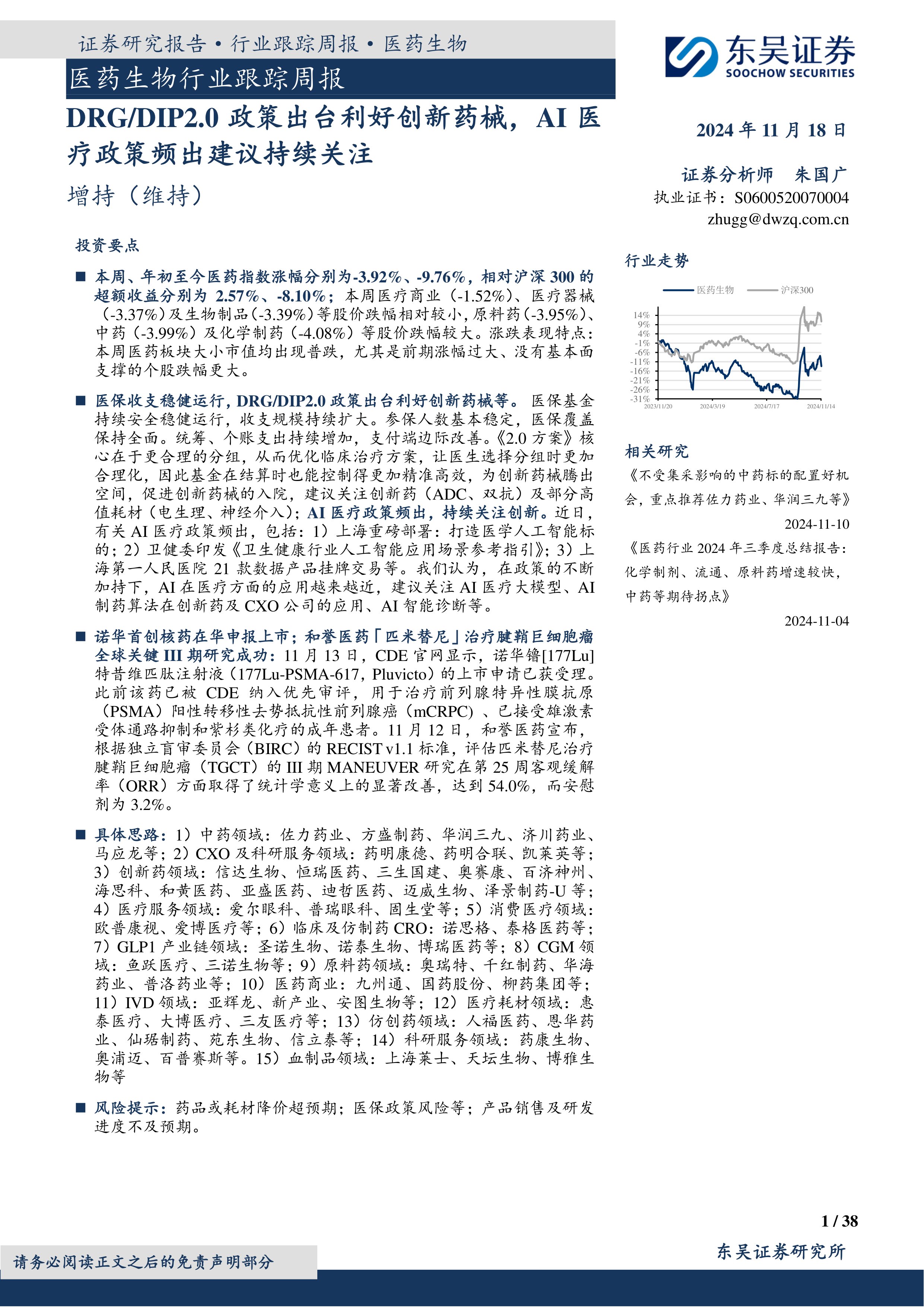 医药生物行业跟踪周报:DRG/DIP2.0政策出台利好创新药械,AI医疗政策频出建议持续关注