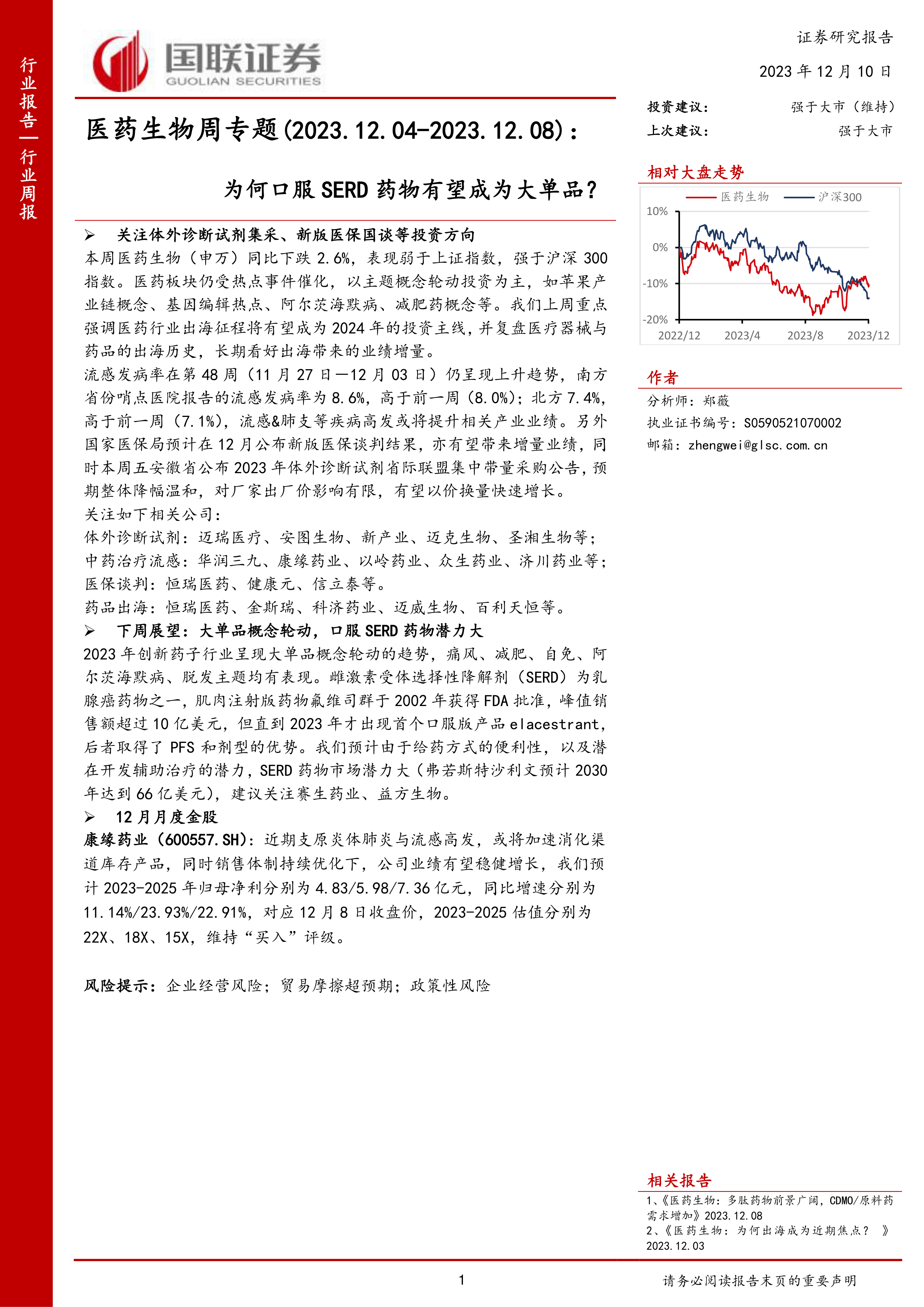本报告分析了医药生物板块的近期行情,指出其投资策略应以主题概念轮动为主,并重点关注口服SERD药物这一潜在的大单品市场。报告还分析了SERD药物的市场规模、开发壁垒以及国内外研发进展,并对体外诊断试剂集采、新版医保国谈等政策进行了解读。最后,报告推荐了康缘药业作为12月月度金股,并提示了企业经营风险、贸易摩擦和政策性风险等潜在风险。 报告数据主要来源于公开资料,仅供参考,不构成投资建议。