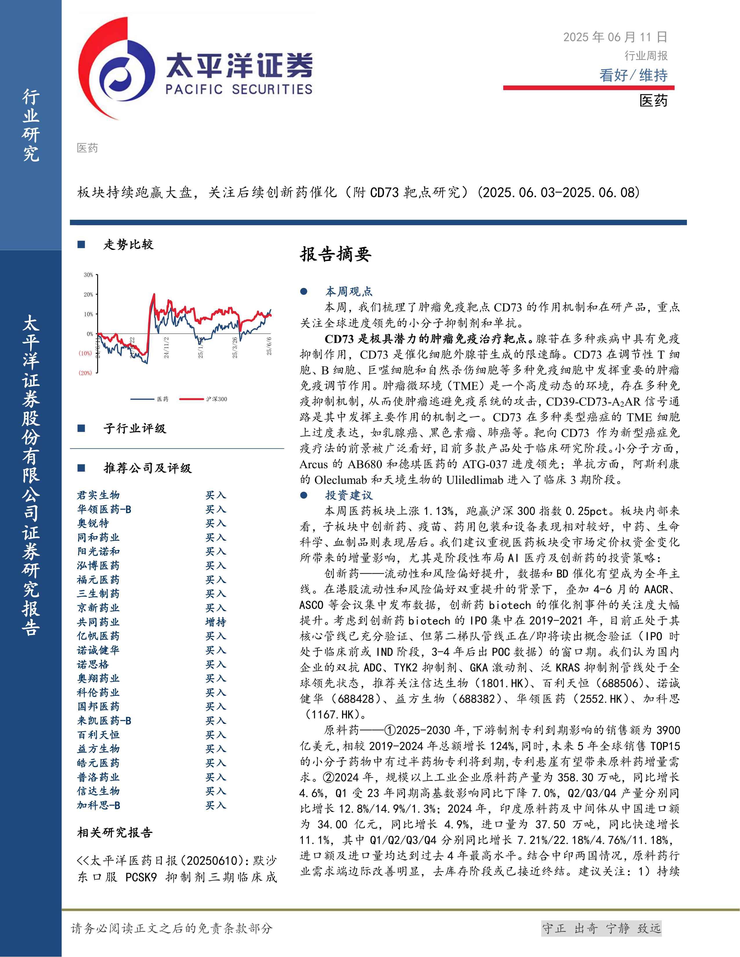 医药行业周报:板块持续跑赢大盘,关注后续创新药催化(附CD73靶点研究)