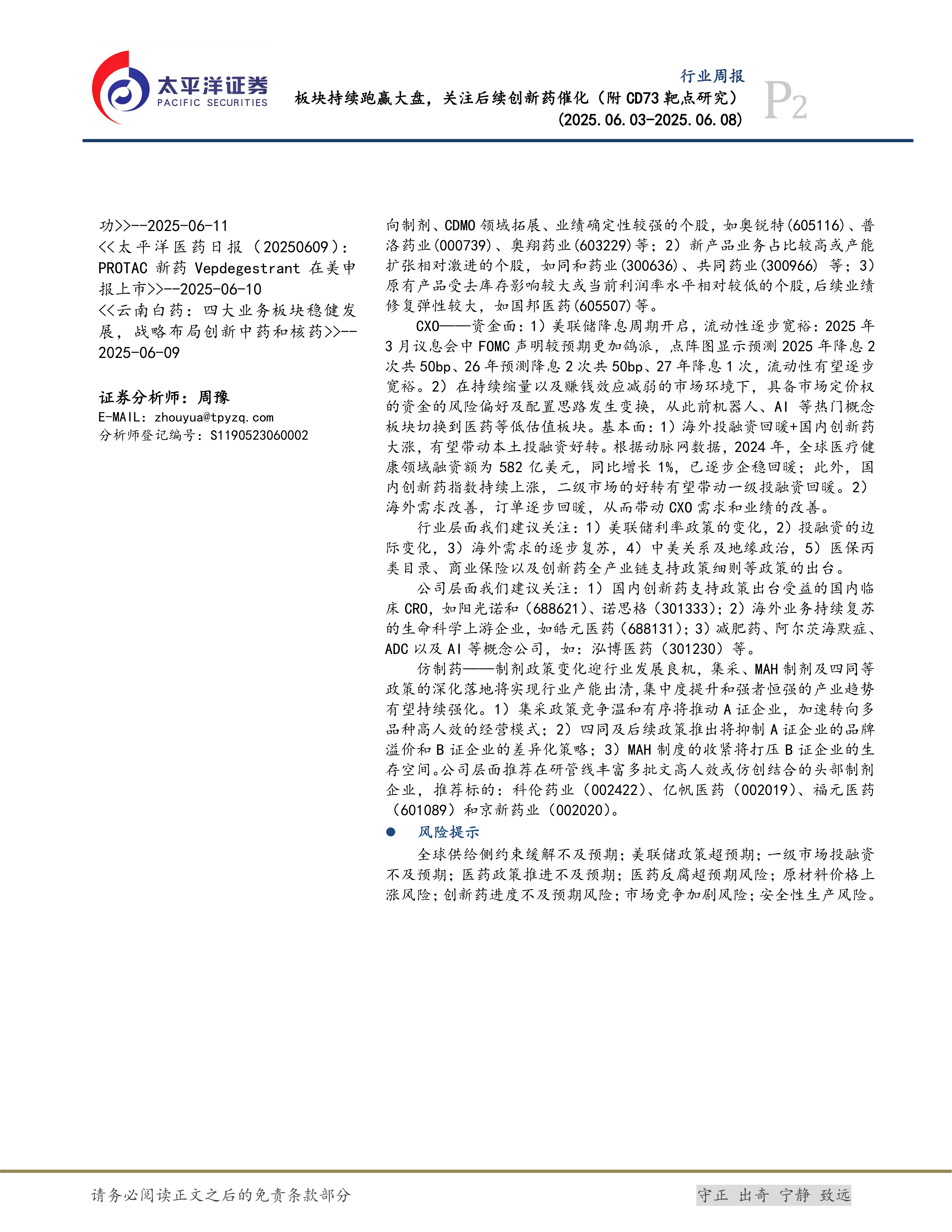 本报告认为医药板块持续跑赢大盘,创新药板块是未来投资主线。CD73靶点药物研发前景广阔,值得关注。报告对创新药、原料药、CXO和仿制药等细分领域进行了深入分析,并给出了具体的投资建议和推荐公司,为投资者提供了有价值的参考信息。 然而,报告也指出了全球供给侧约束缓解不及预期、美联储政策超预期、一级市场投融资不及预期等风险因素,投资者需谨慎决策。