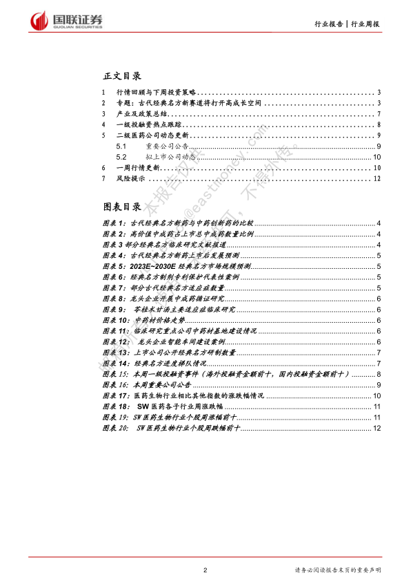 本报告的核心观点是:医药生物行业本周表现强于大盘,主要受新冠治疗概念股、医疗器械概念股以及中成药等因素驱动。国家医保谈判和疫后复苏将带来业绩增量,古代经典名方新赛道也蕴藏着高成长空间。报告建议关注国家医保药品谈判带来的增量业绩,推荐具备多热门靶点、多品种参加谈判的恒瑞医药、人福医药,并持续推荐医疗新基建设备相关标的。