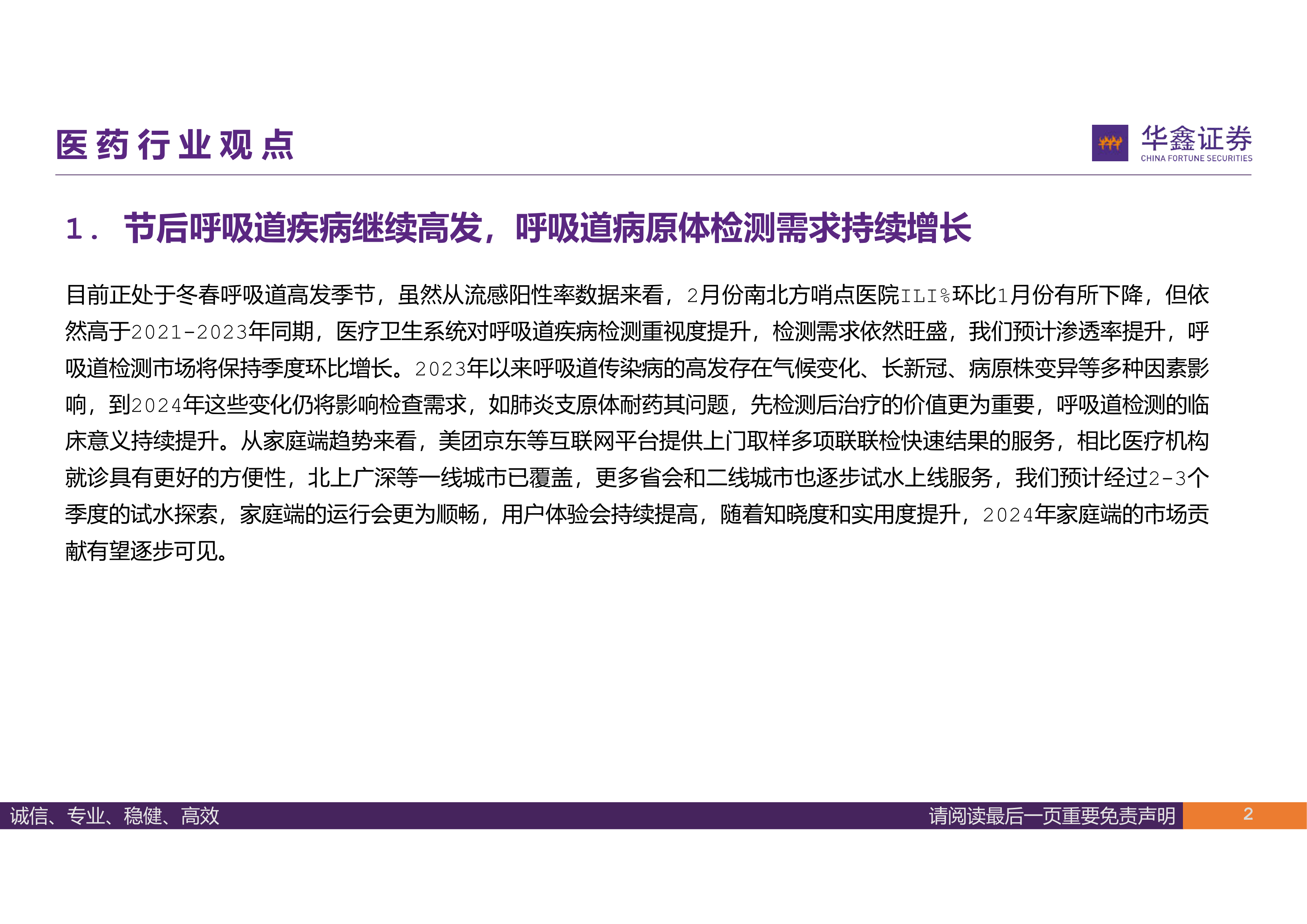 报告首先分析了节后呼吸道疾病高发导致的呼吸道病原体检测需求持续增长,并指出气候变化、长新冠和病原株变异等因素将持续影响检查需求。报告还强调了家庭端上门取样检测服务的兴起,预计其市场贡献将在2024年逐步显现。