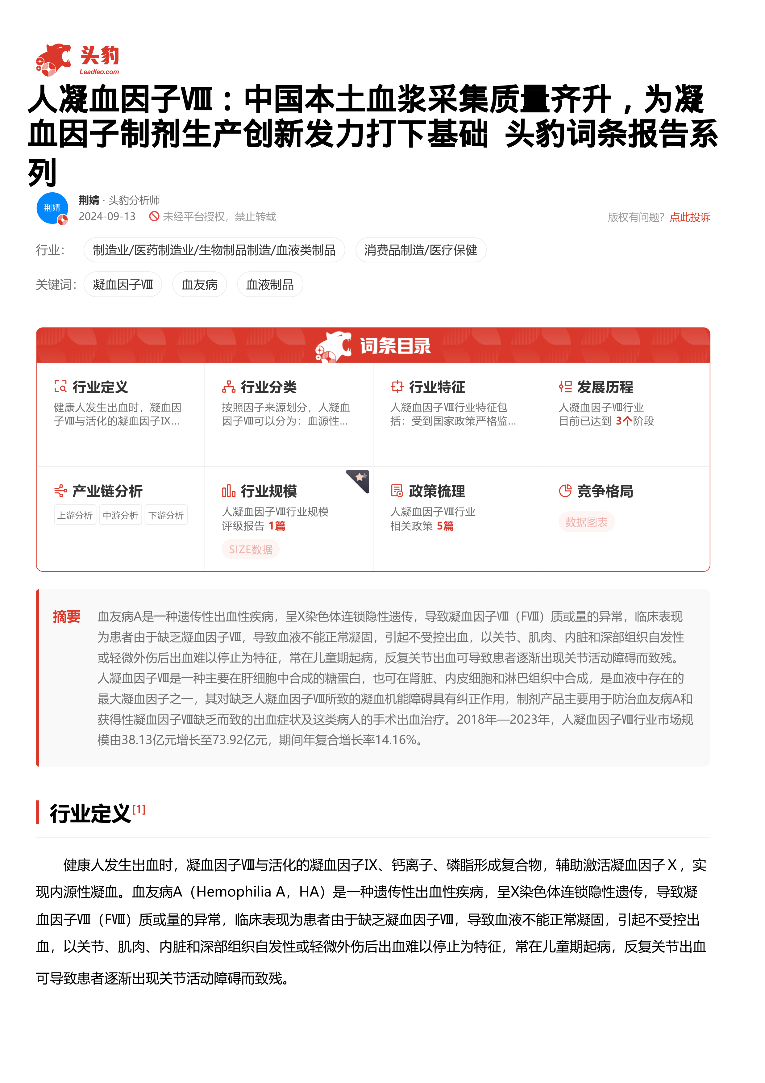 本报告基于Leadleo.com发布的《人凝血因子Ⅷ:中国本土血浆采集质量齐升,为凝血因子制剂生产创新发力打下基础》词条报告,运用数据和统计分析方法,对中国的人凝血因子Ⅷ市场进行深入分析。报告核心观点如下: