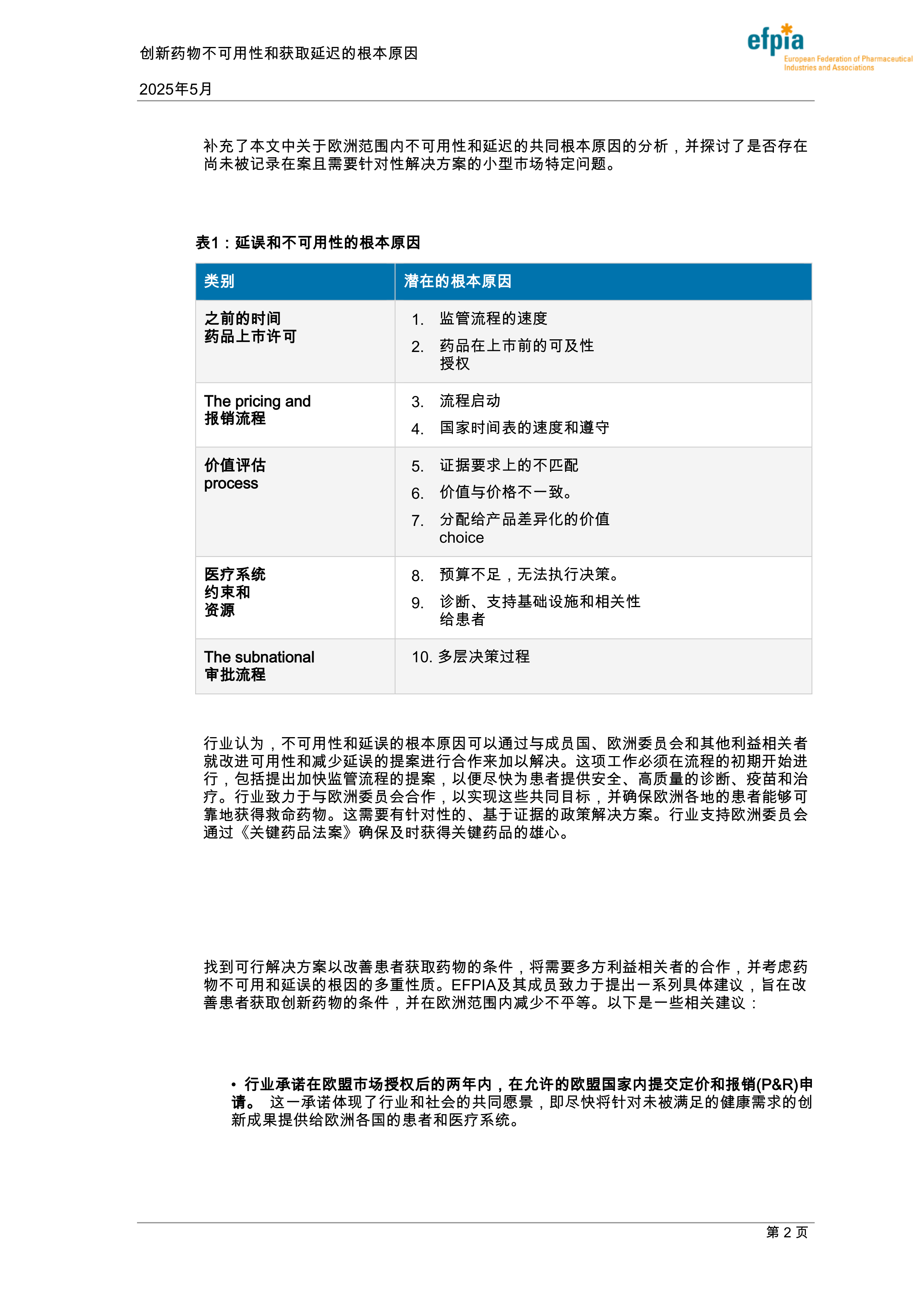 过去五年中展现出的前所未有的创新速度以及行业管道的潜力为改善患者结果提供重要机遇。普遍共识是创新的真正价值只有在患者从治疗进步中获益时才能实现。然而,大量药物并非在所有欧盟(EU)市场都可用。
