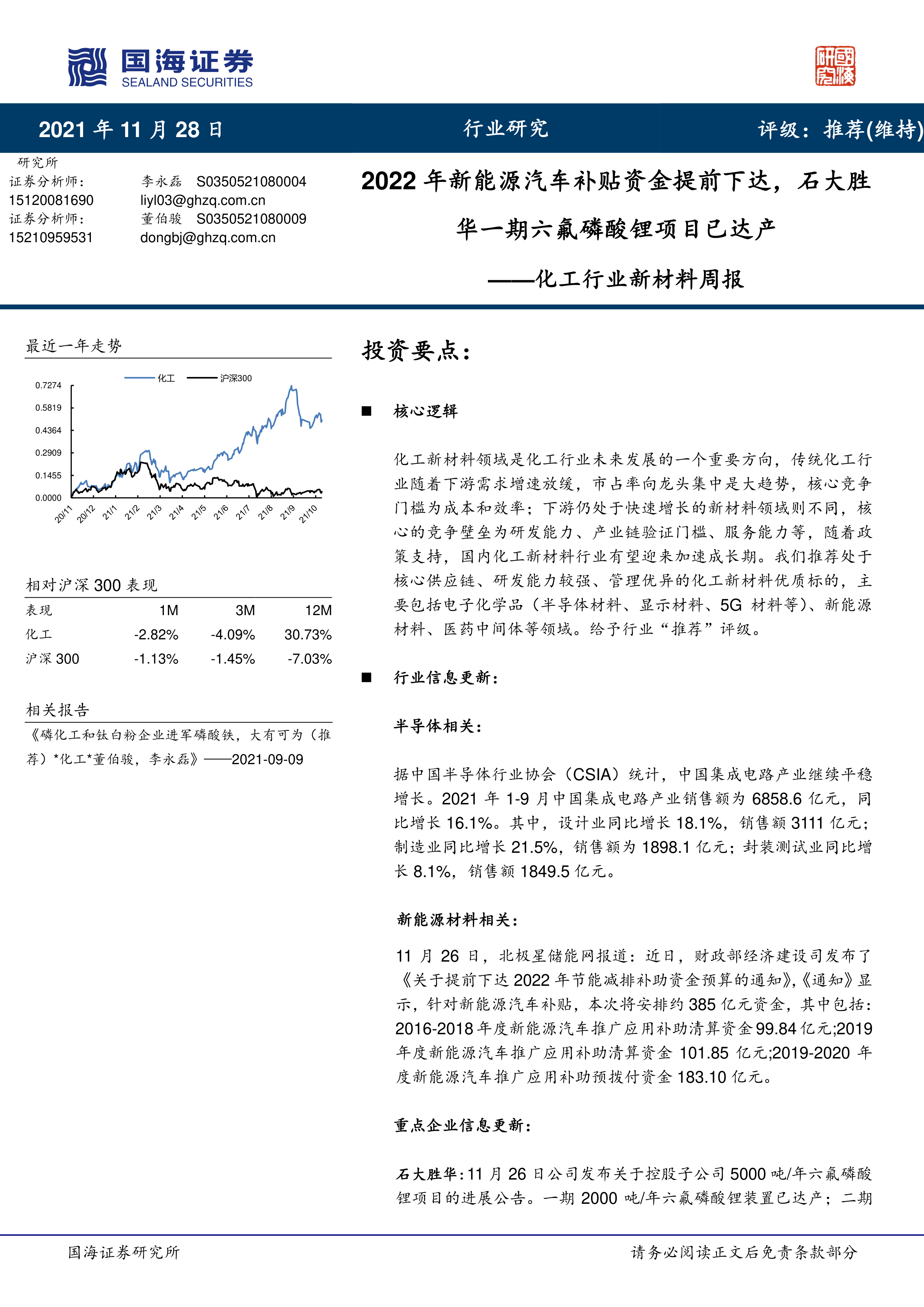 化工行业新材料周报:2022年新能源汽车补贴资金提前下达,石大胜华一期六氟磷酸锂项目已达产