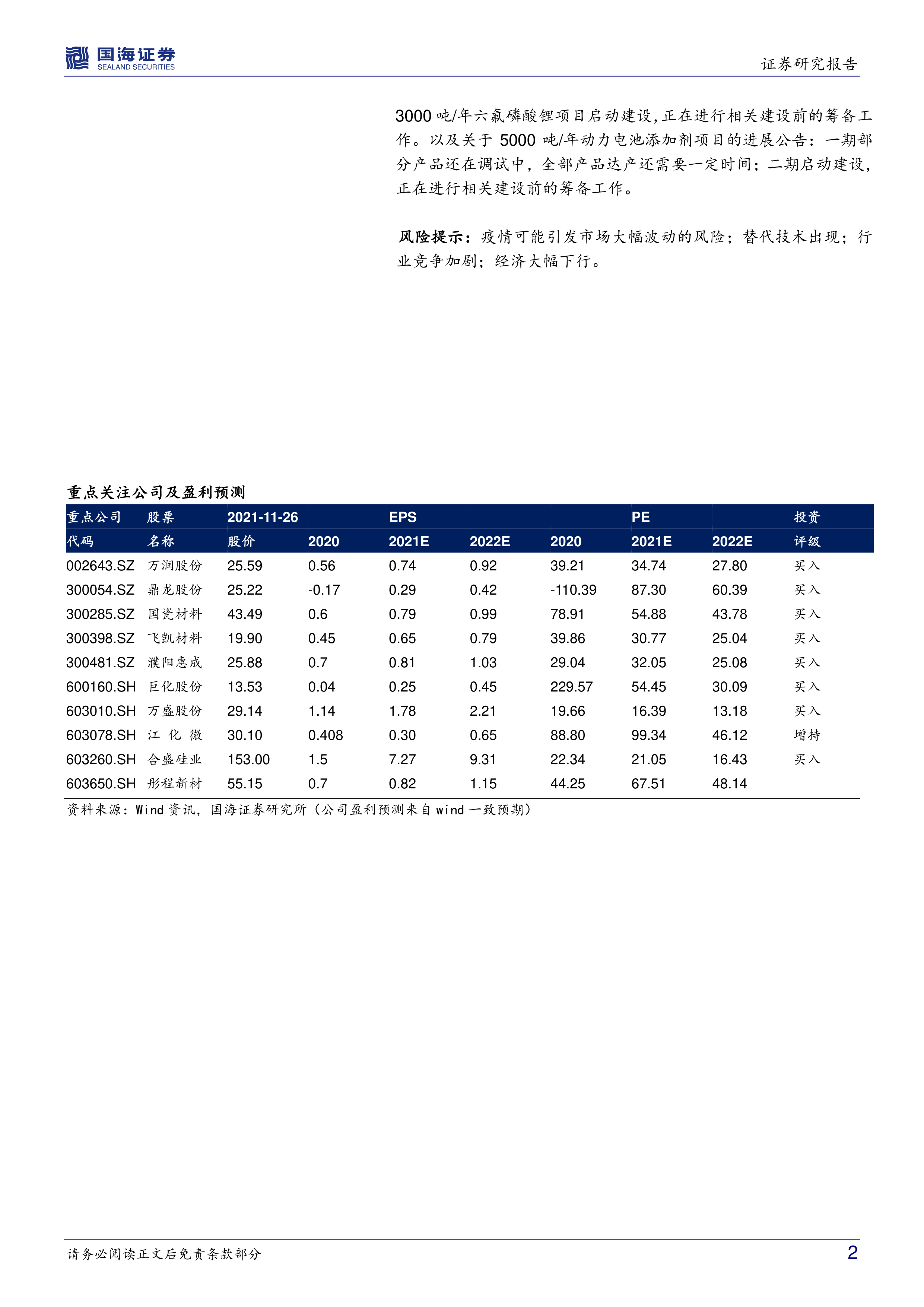 石大胜华:11月26日公司发布关于控股子公司5000吨/年六氟磷酸锂项目的进展公告。一期2000吨/年六氟磷酸锂装置已达产;二期3000吨/年六氟磷酸锂项目启动建设,正在进行相关建设前的筹备工作。以及关于5000吨/年动力电池添加剂项目的进展公告:一期部分产品还在调试中,全部产品达产还需要一定时间;二期启动建设,正在进行相关建设前的筹备工作。