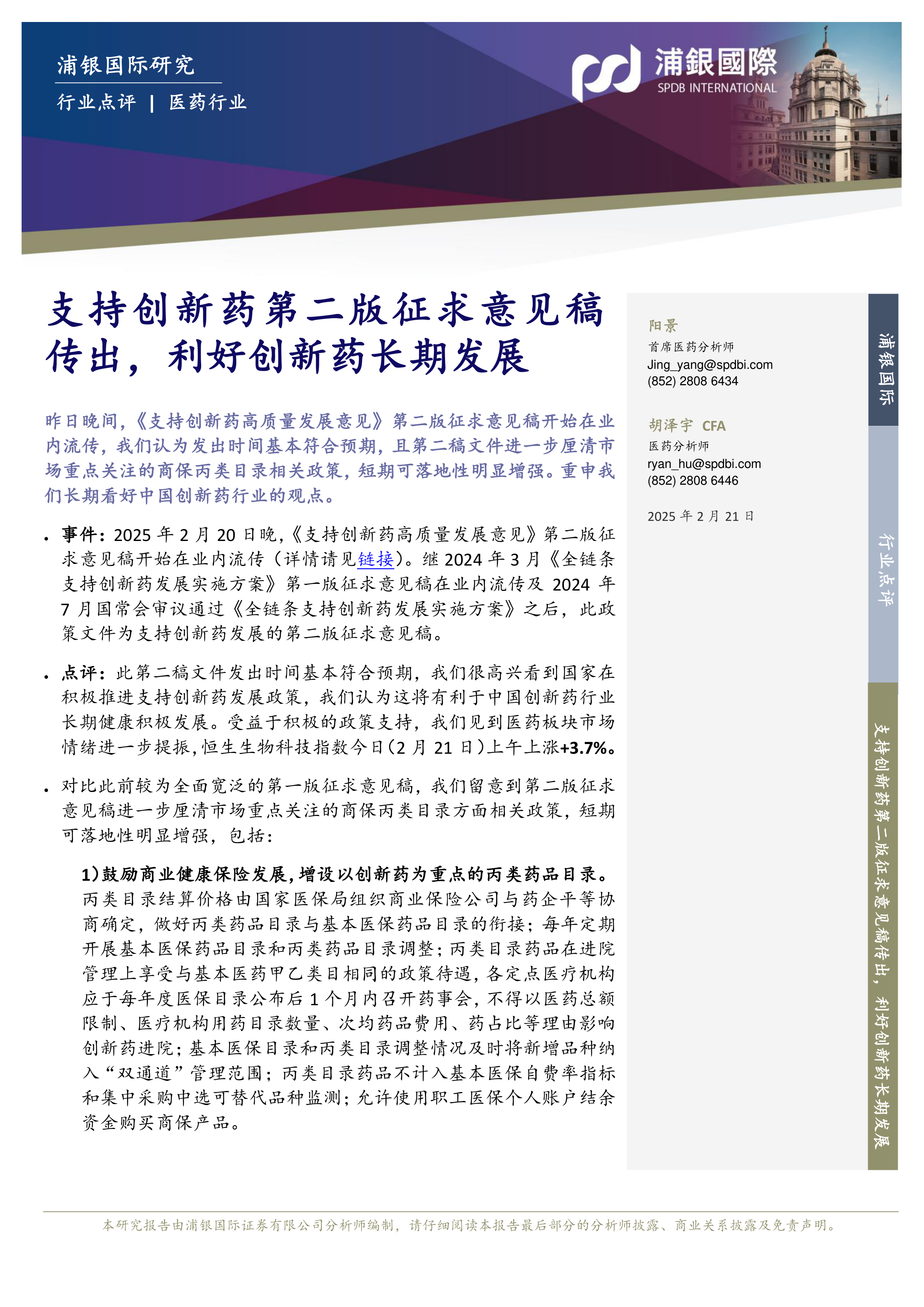 点评:此第二稿文件发出时间基本符合预期,我们很高兴看到国家在积极推进支持创新药发展政策,我们认为这将有利于中国创新药行业长期健康积极发展。受益于积极的政策支持,我们见到医药板块市场情绪进一步提振,恒生生物科技指数今日(2月21日)上午上涨+3.7%。