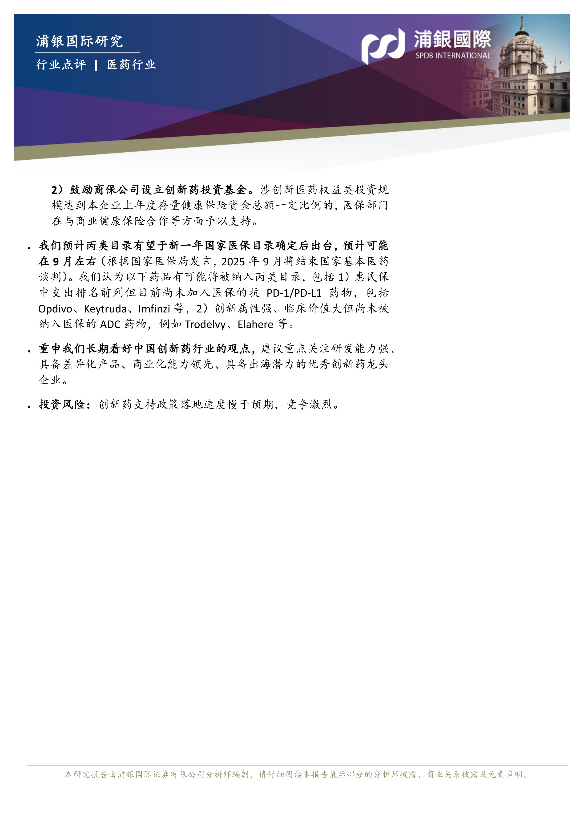 我们预计丙类目录有望于新一年国家医保目录确定后出台,预计可能在9月左右(根据国家医保局发言,2025年9月将结束国家基本医药谈判)。我们认为以下药品有可能将被纳入丙类目录,包括1)惠民保中支出排名前列但目前尚未加入医保的抗PD-1/PD-L1药物,包括Opdivo、Keytruda、Imfinzi等,2)创新属性强、临床价值大但尚未被纳入医保的ADC药物,例如Trodelvy、Elahere等。