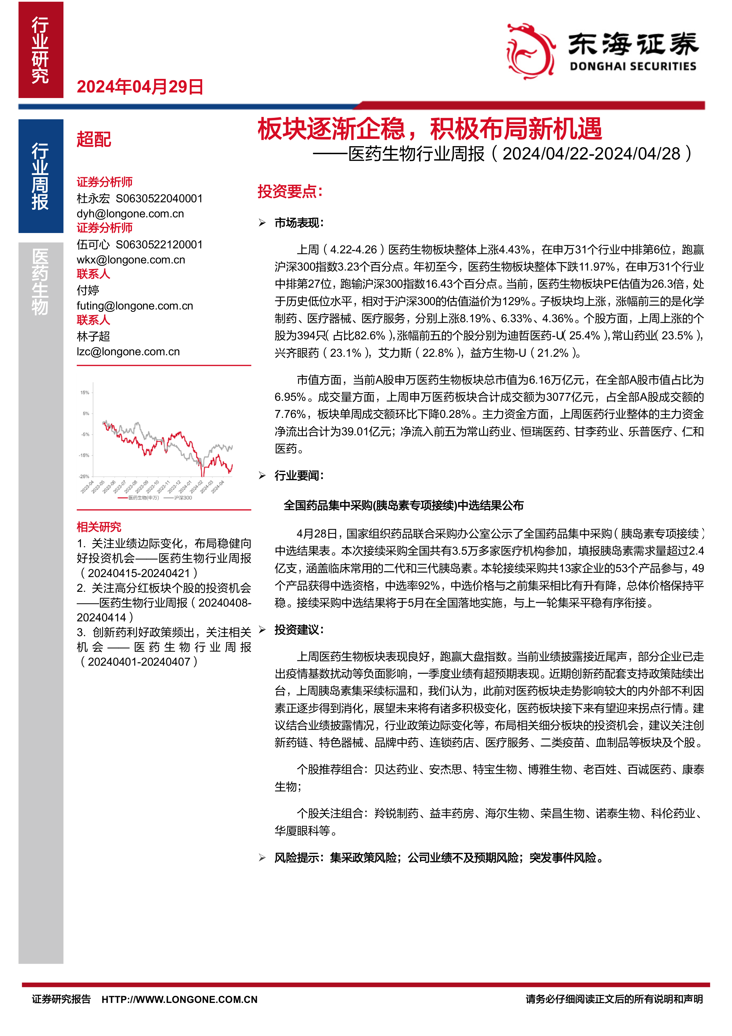 个股关注组合:羚锐制药、益丰药房、海尔生物、荣昌生物、诺泰生物、科伦药业、华厦眼科等。