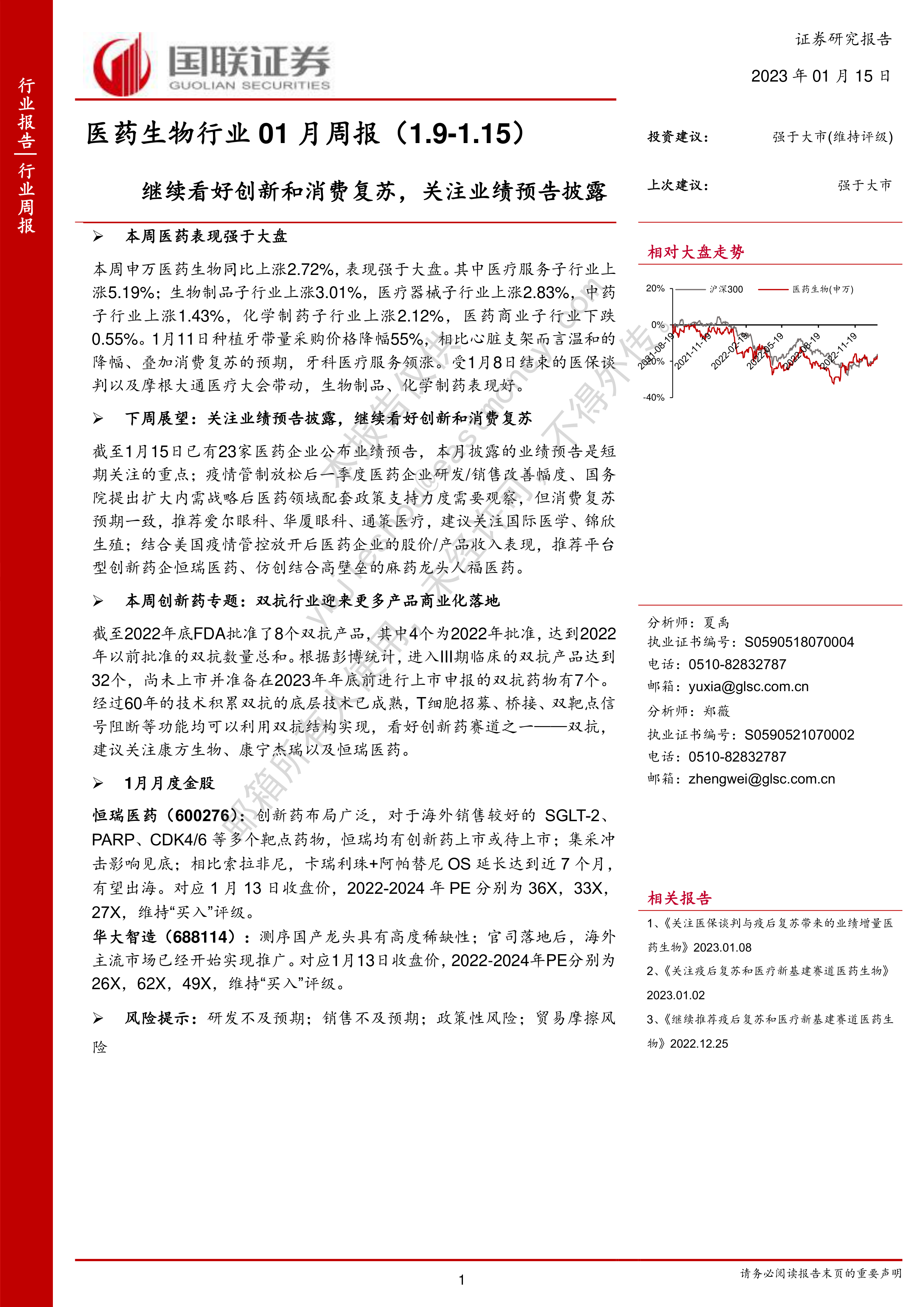 截至1月15日已有23家医药企业公布业绩预告, 本月披露的业绩预告是短期关注的重点;疫情管制放松后一季度医药企业研发/销售改善幅度、国务院提出扩大内需战略后医药领域配套政策支持力度需要观察,但消费复苏预期一致,推荐爱尔眼科、华厦眼科、通策医疗,建议关注国际医学、锦欣生殖;结合美国疫情管控放开后医药企业的股价/产品收入表现,推荐平台型创新药企恒瑞医药、仿创结合高壁垒的麻药龙头人福医药。