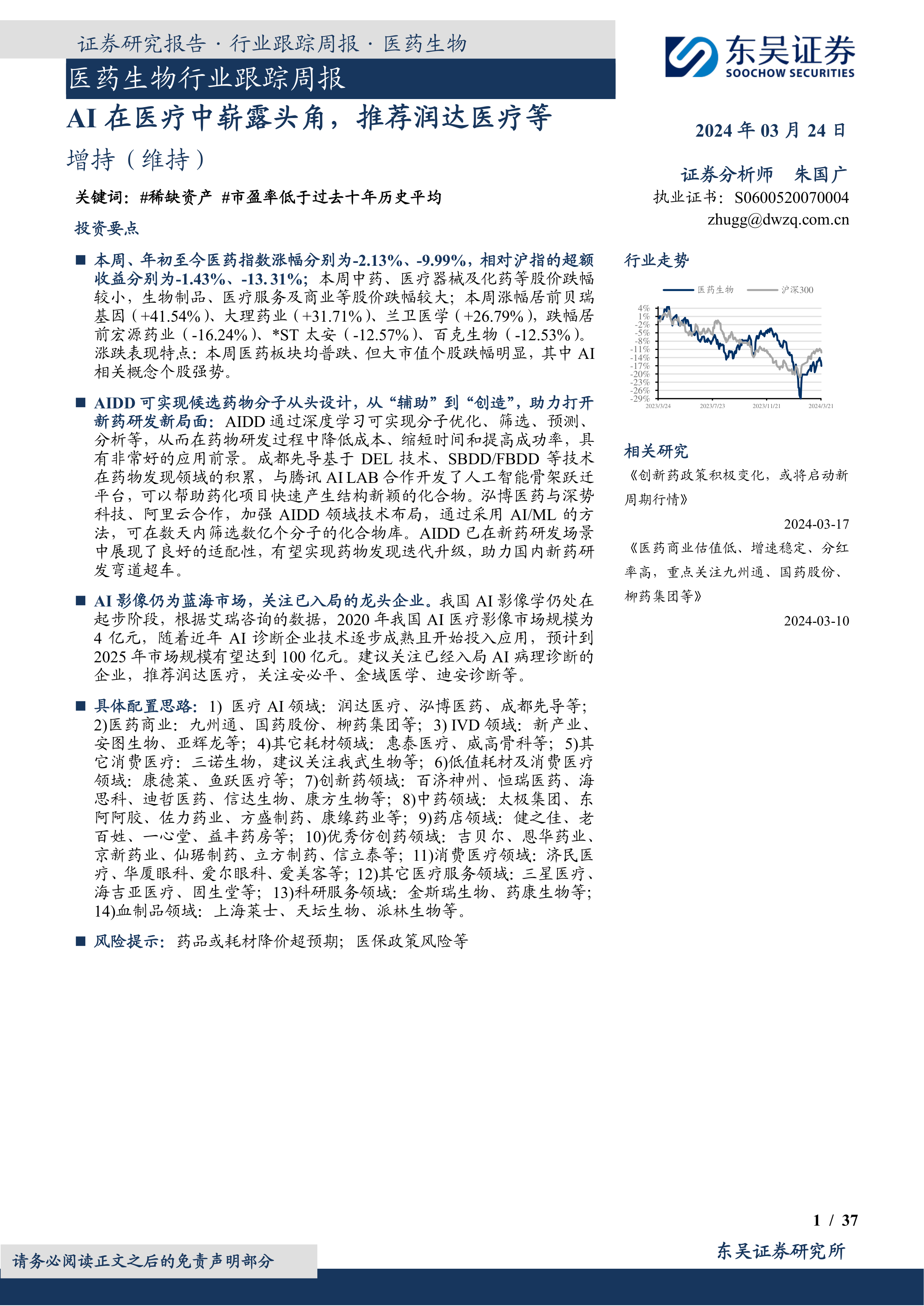 医药生物行业跟踪周报:AI在医疗中崭露头角,推荐润达医疗等