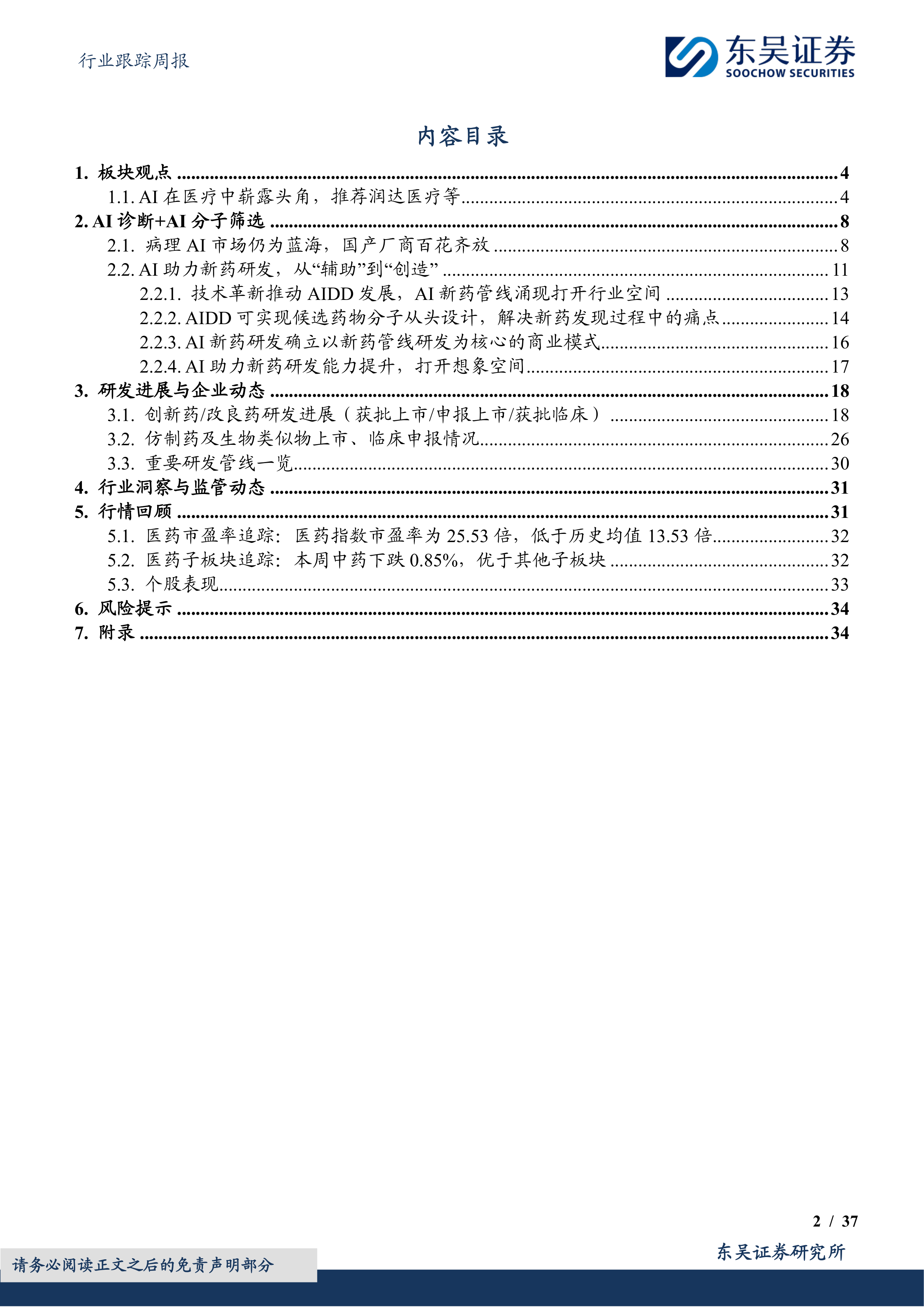 本报告的核心观点是:人工智能(AI)技术正在深刻改变医疗行业,为医药板块带来新的增长动力。报告重点关注AI在医疗影像诊断和药物研发中的应用,并推荐润达医疗等相关公司。同时,报告也分析了医药板块整体走势、估值水平以及潜在风险。