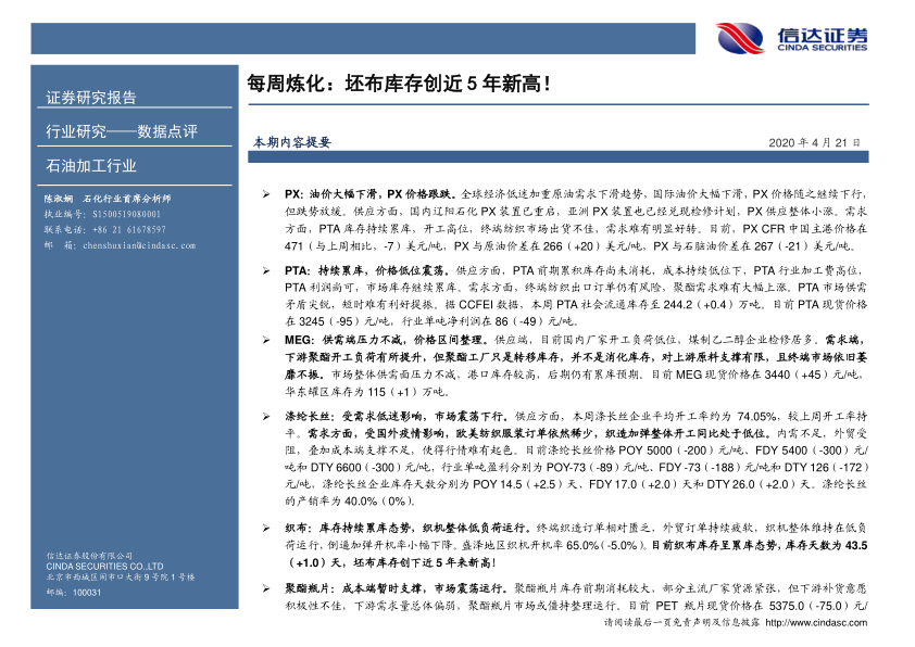 本报告以数据点评的形式,对2020年4月21日一周内中国石油化工行业主要产品的市场行情进行了分析。报告涵盖了PX、PTA、MEG、涤纶长丝、织布和聚酯瓶片等多个环节,并对信达大炼化指数进行了跟踪。