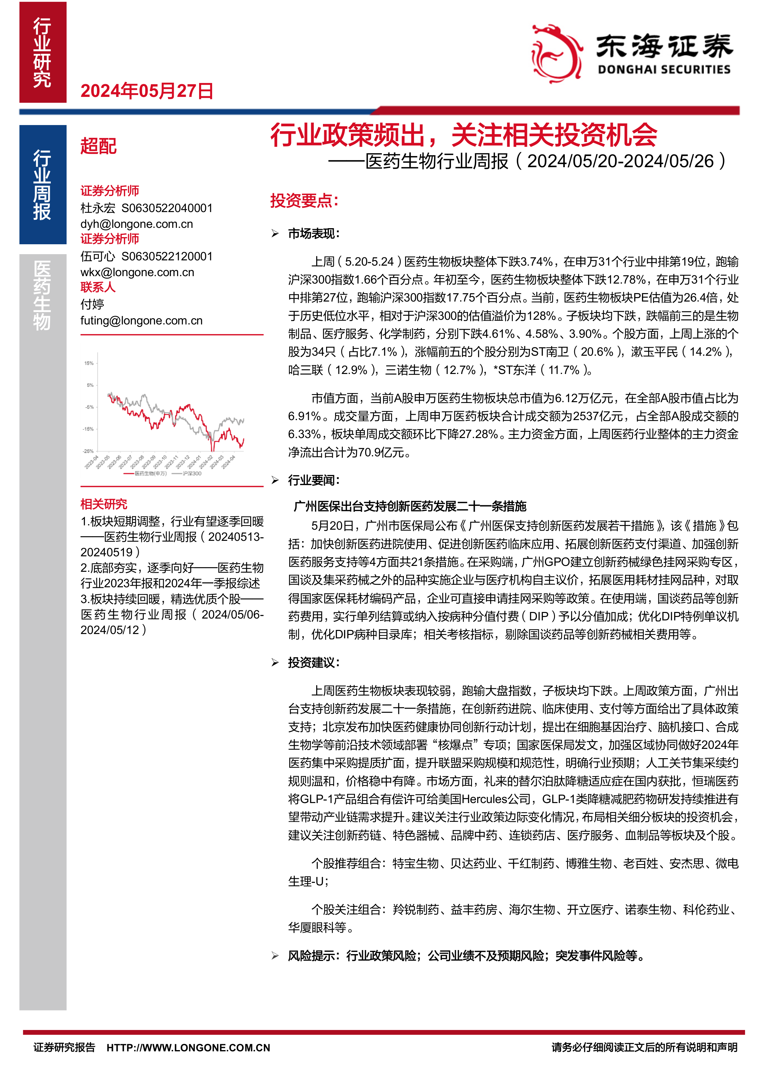 本报告对2024年5月20日至2024年5月26日医药生物板块的市场表现、行业政策和投资机会进行了全面分析。 尽管短期内板块表现疲软,但估值处于低位,且多项政策利好创新药发展,为行业长期向好发展提供了支撑。 投资者应密切关注政策变化,选择具有长期发展潜力的细分板块和个股进行投资,同时需谨慎评估政策风险、业绩风险和突发事件风险。