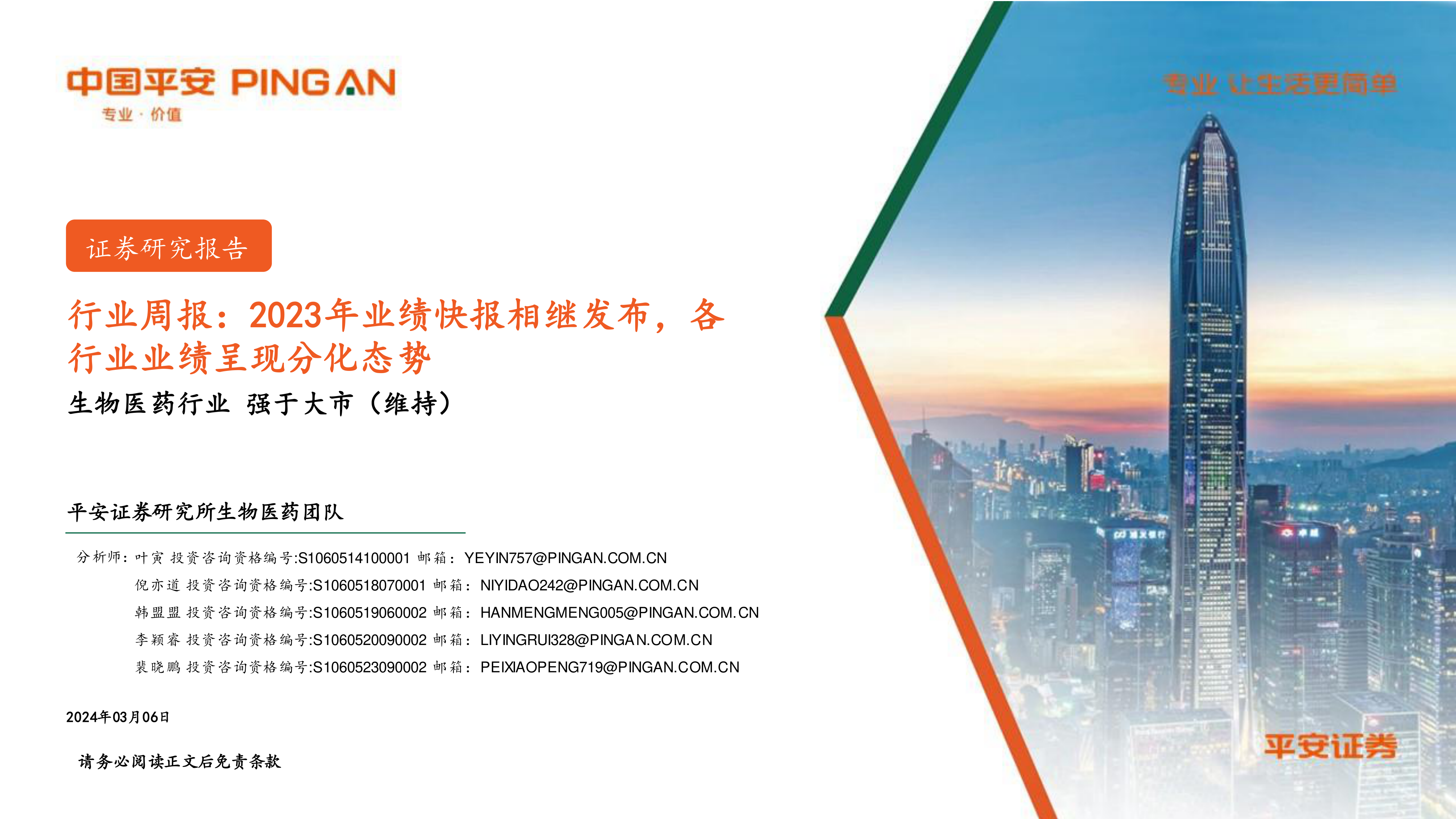 生物医药行业周报:2023年业绩快报相继发布,各行业业绩呈现分化态势