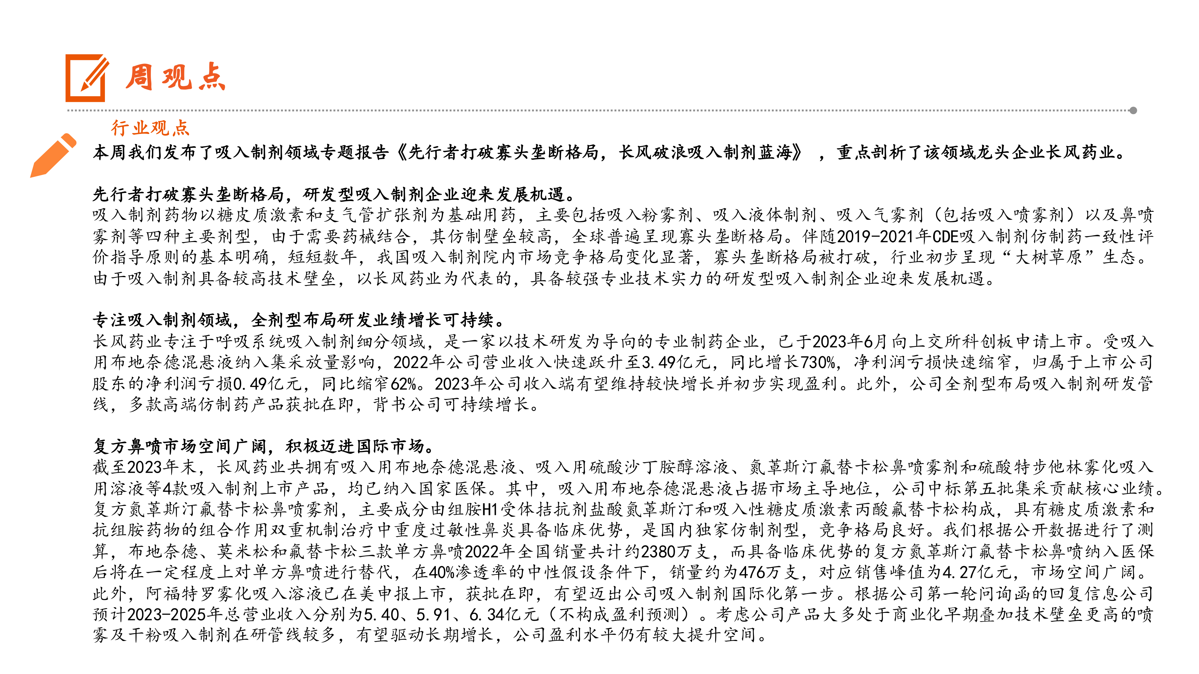 本周我们发布了吸入制剂领域专题报告《先行者打破寡头垄断格局, 长风破浪吸入制剂蓝海》 , 重点剖析了该领域龙头企业长风药业。