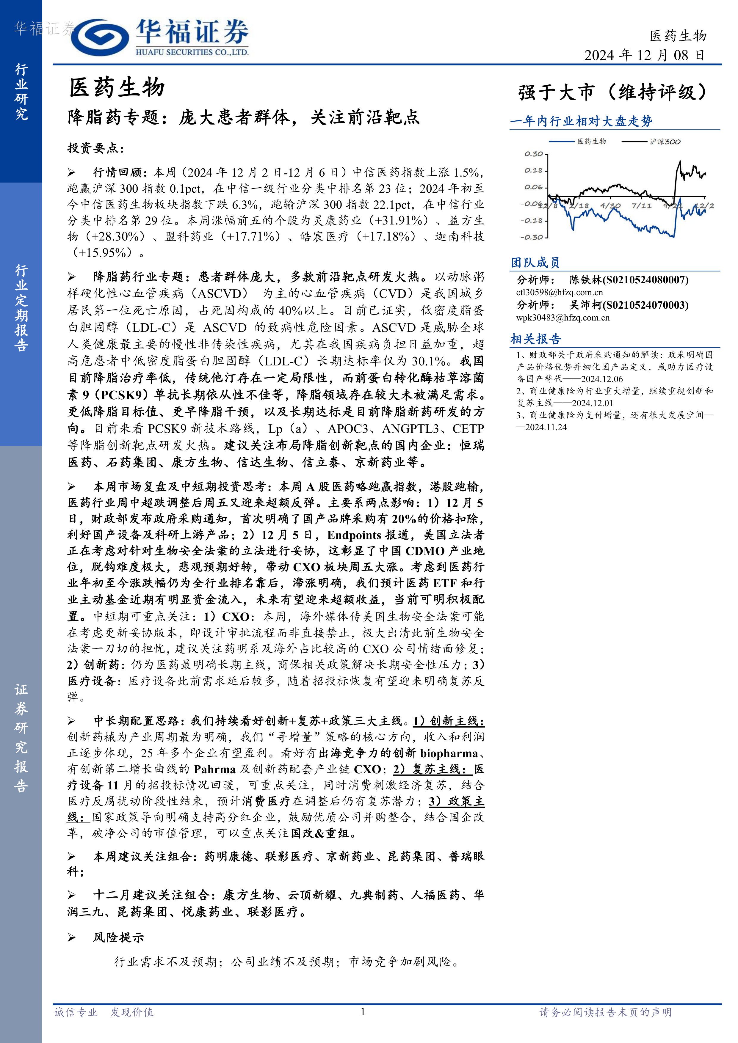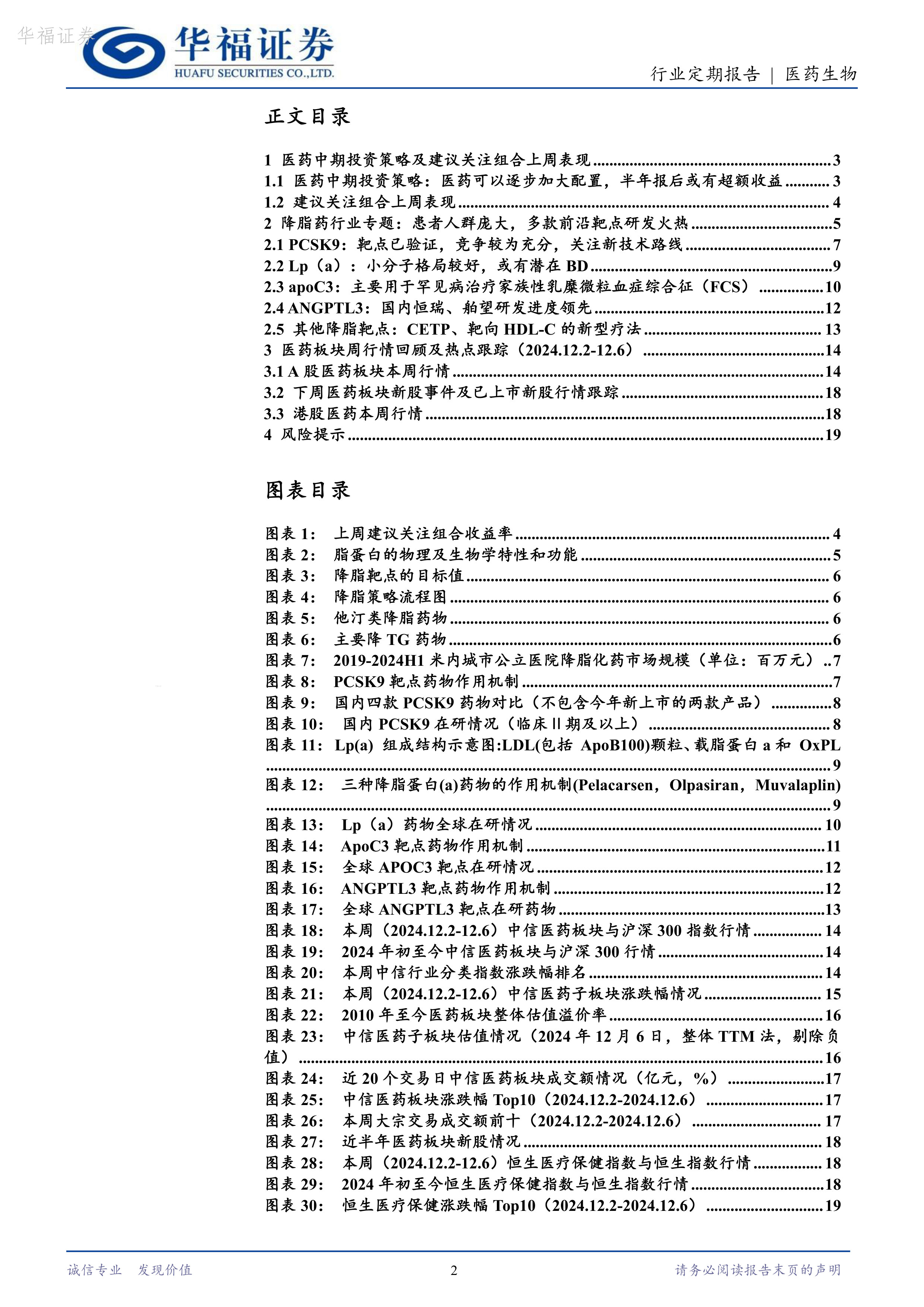 本报告对医药生物行业进行了全面的市场分析,指出短期内医药板块有望迎来超额收益,长期来看,创新药械、医疗设备复苏和政策扶持下的国企改革将是主要投资方向。降脂药市场由于庞大的患者群体和多款前沿靶点研发火热而具有巨大潜力,但同时也面临着激烈的市场竞争和研发风险。投资者需关注政策变化、市场趋势以及公司自身的基本面,谨慎决策,自担投资风险。 报告中详细分析了多个降脂药靶点,并对部分有潜力的国内企业进行了推荐。 同时,报告也提供了A股和港股医药板块的周行情回顾,为投资者提供更全面的市场信息。