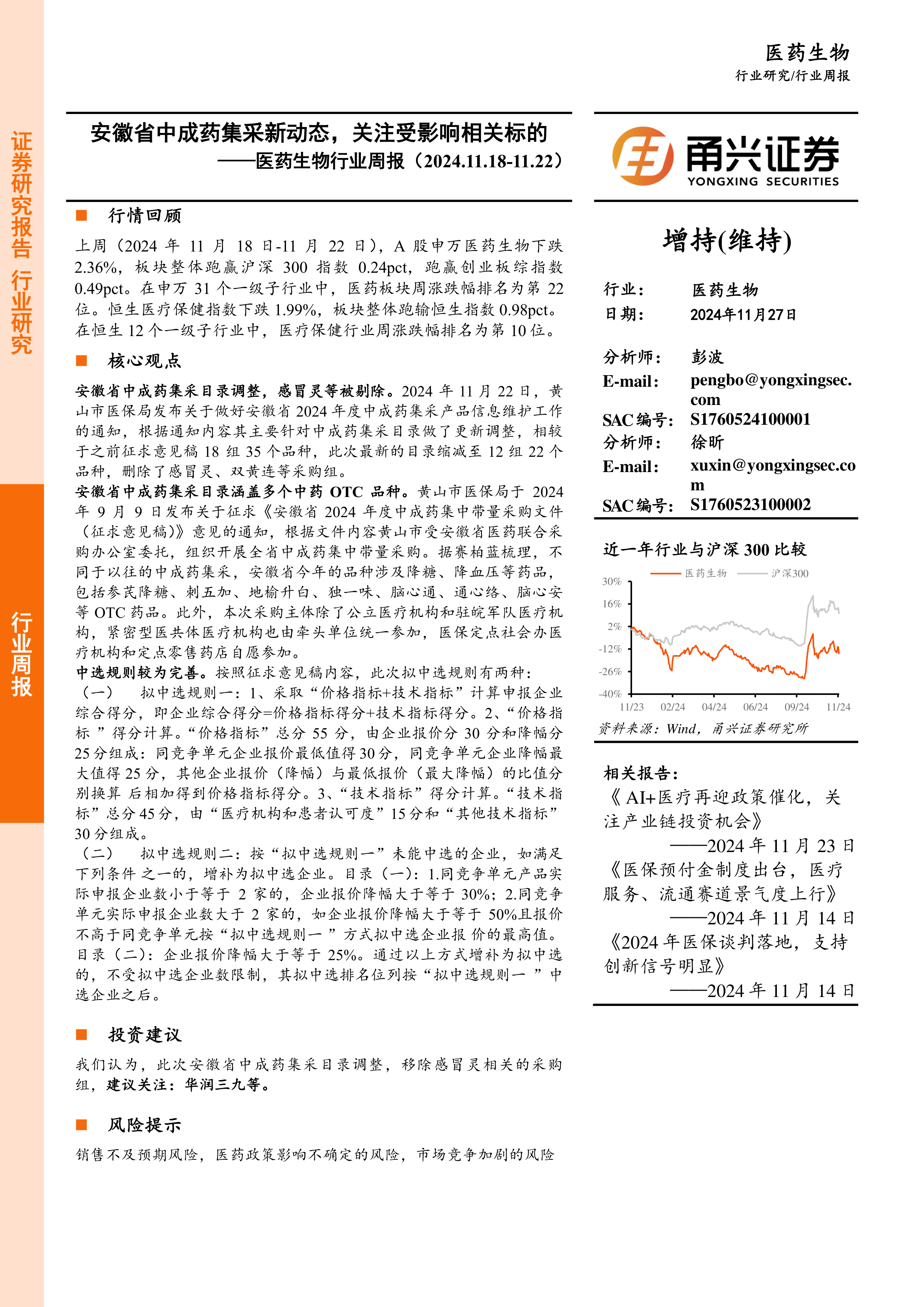 报告首先回顾了2024年11月18日至11月22日A股和港股医药板块的市场表现。A股申万医药生物指数下跌2.36%,跑赢沪深300指数和创业板综指;恒生医疗保健指数下跌1.99%,跑输恒生指数。报告还列出了A股和港股医药行业个股涨跌幅前五名,数据显示个股涨跌幅波动较大,市场表现分化明显。 图表数据直观地展现了市场整体走势和个股的差异化表现。