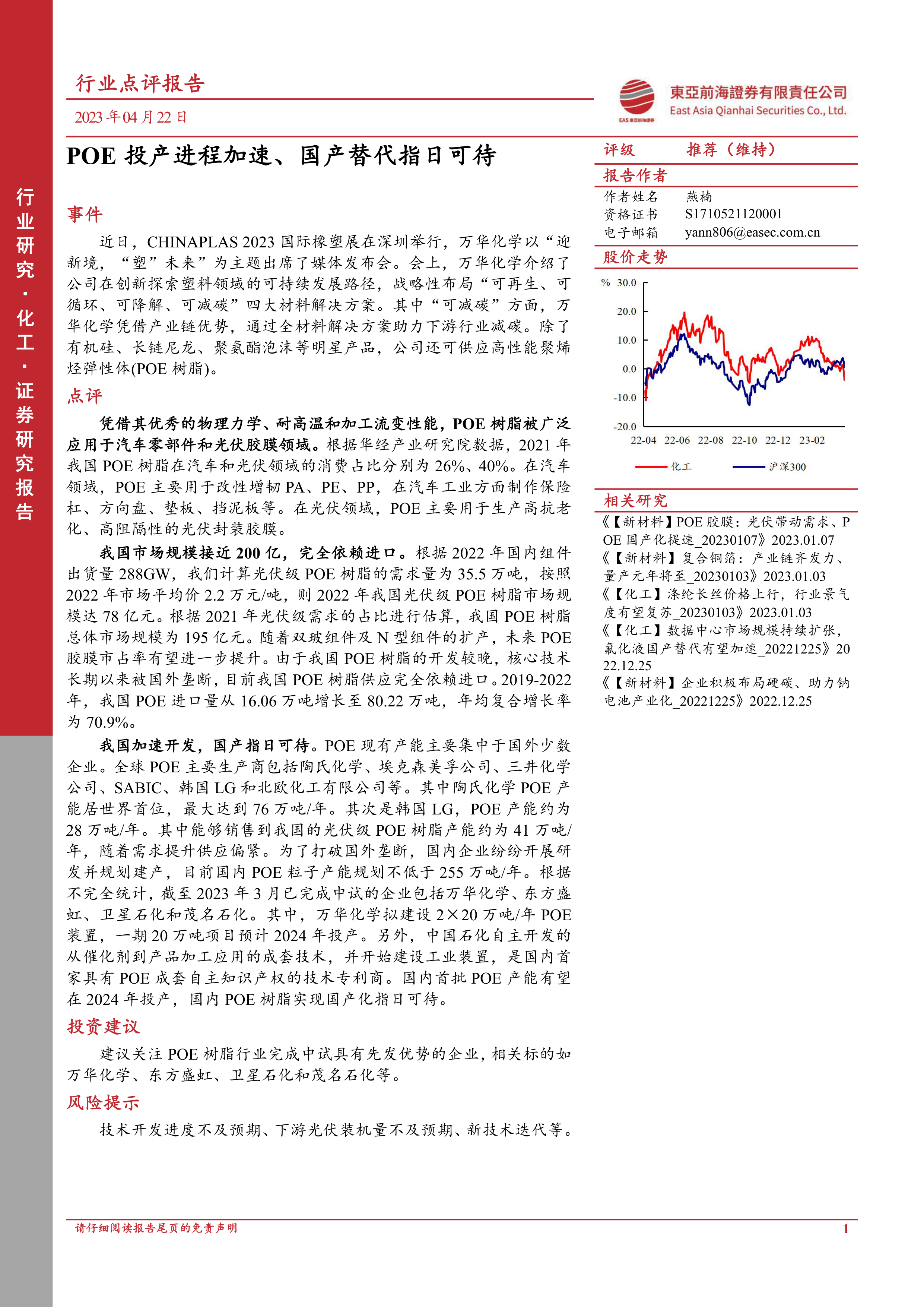 化工:POE投产进程加速、国产替代指日可待