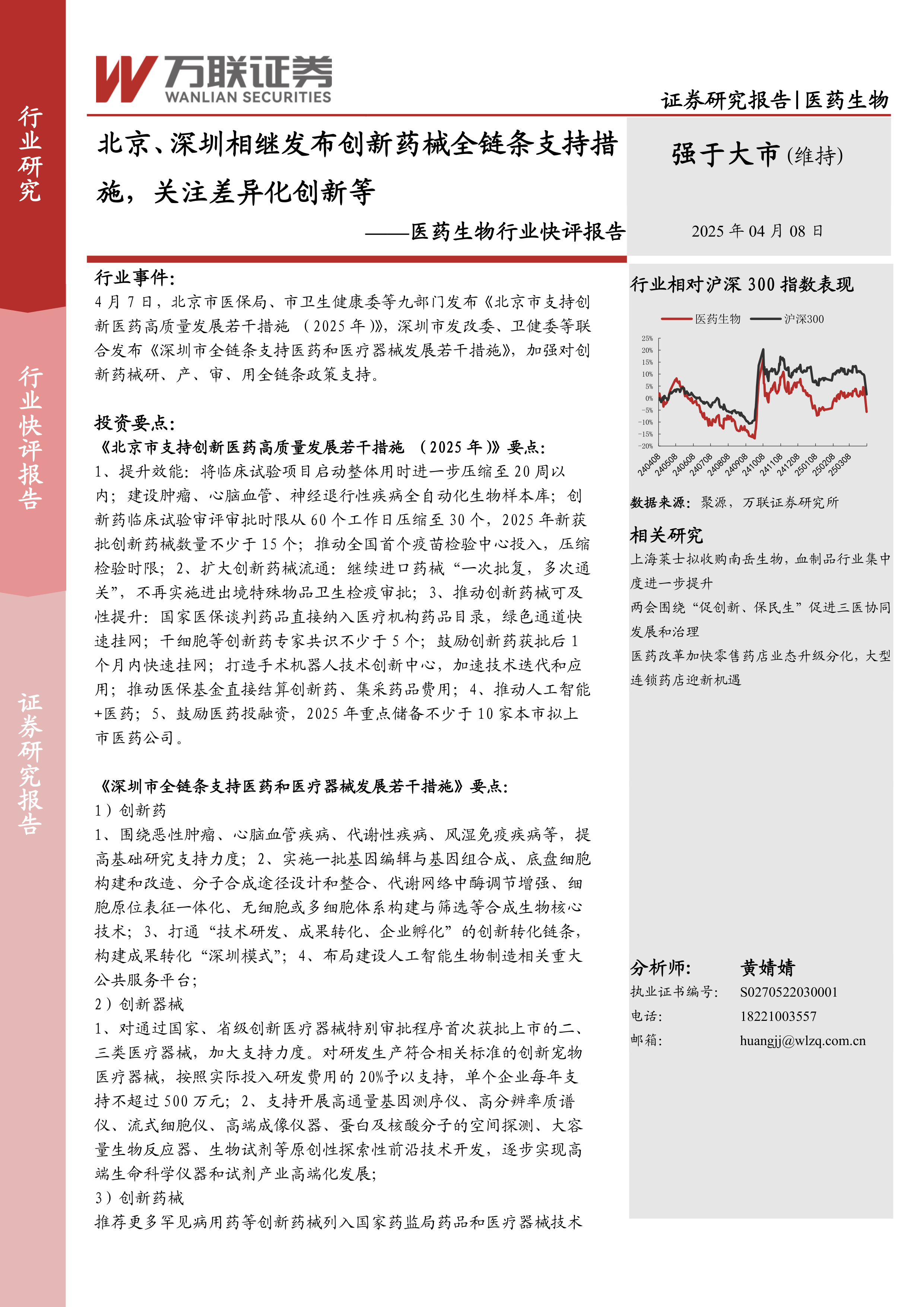 4月7日,北京市医保局、市卫生健康委等九部门发布《北京市支持创新医药高质量发展若干措施(2025年)》,深圳市发改委、卫健委等联合发布《深圳市全链条支持医药和医疗器械发展若干措施》,加强对创新药械研、产、审、用全链条政策支持。