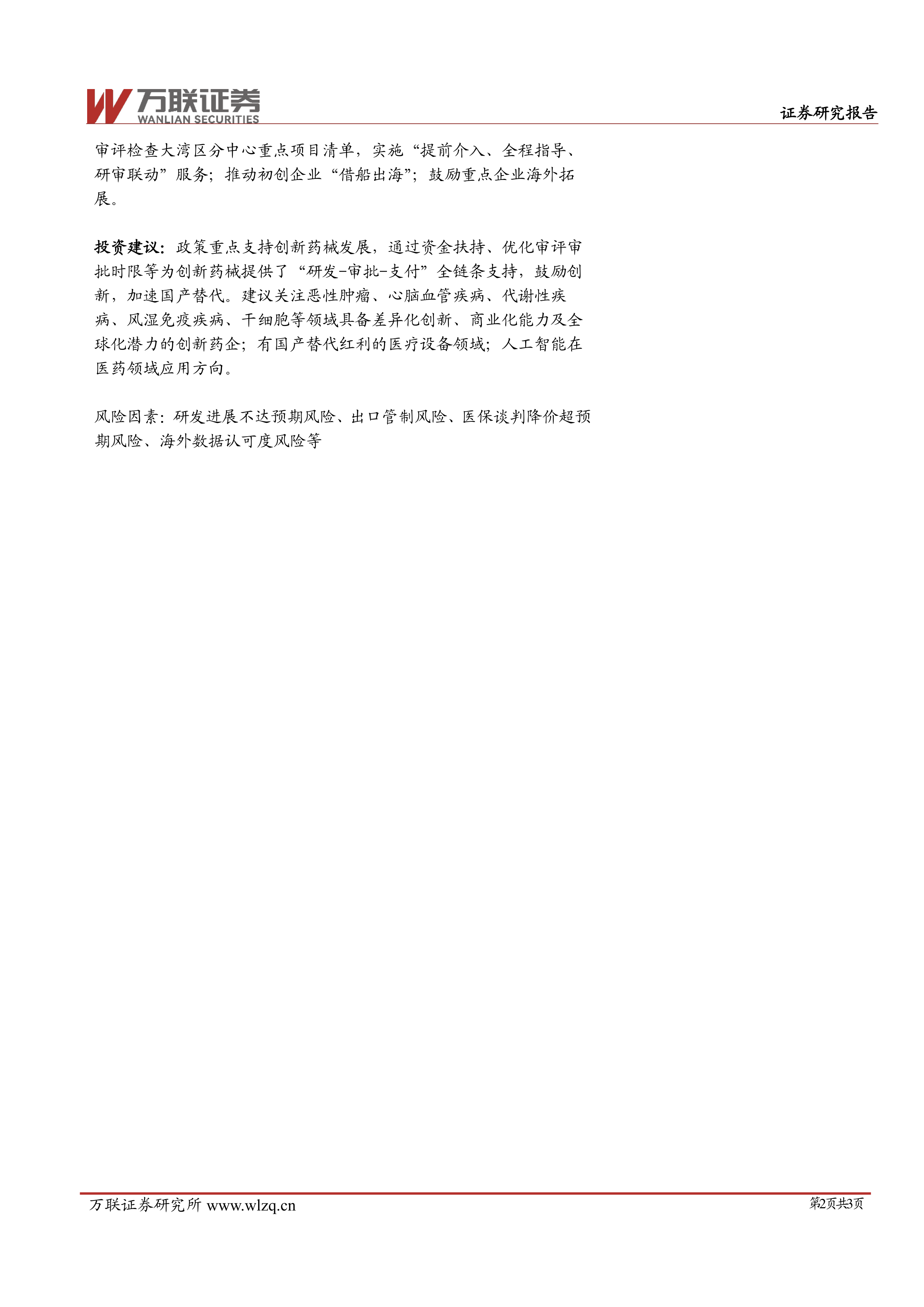 投资建议:政策重点支持创新药械发展,通过资金扶持、优化审评审批时限等为创新药械提供了“研发-审批-支付”全链条支持,鼓励创新,加速国产替代。建议关注恶性肿瘤、心脑血管疾病、代谢性疾病、风湿免疫疾病、干细胞等领域具备差异化创新、商业化能力及全球化潜力的创新药企;有国产替代红利的医疗设备领域;人工智能在医药领域应用方向。