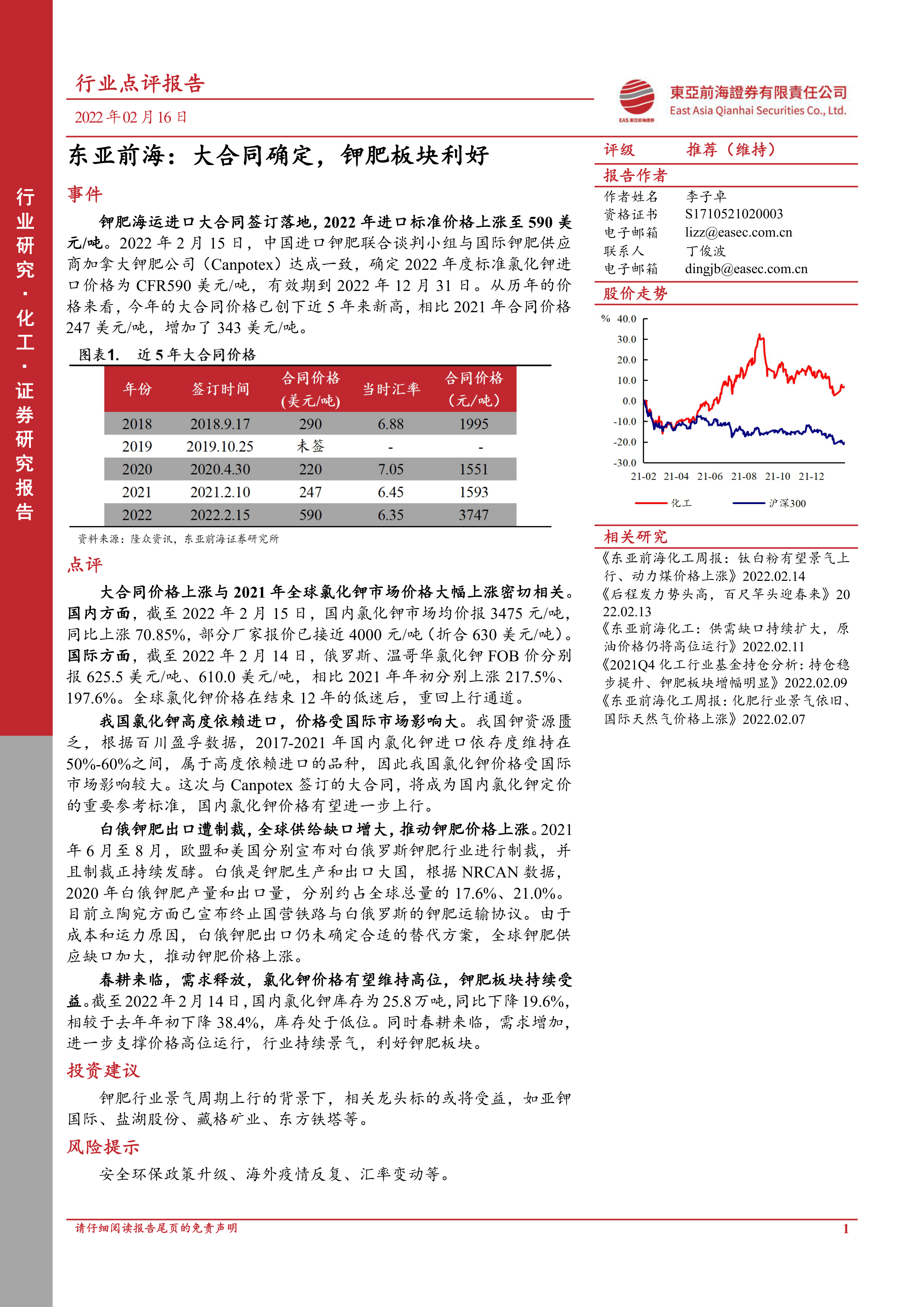 本报告的核心观点是:2022年中国进口钾肥大合同价格上涨至创纪录的590美元/吨,这主要源于全球钾肥供需格局的变化和地缘政治因素的影响。 这一价格上涨将显著影响国内钾肥市场价格,并利好国内钾肥板块相关上市公司。