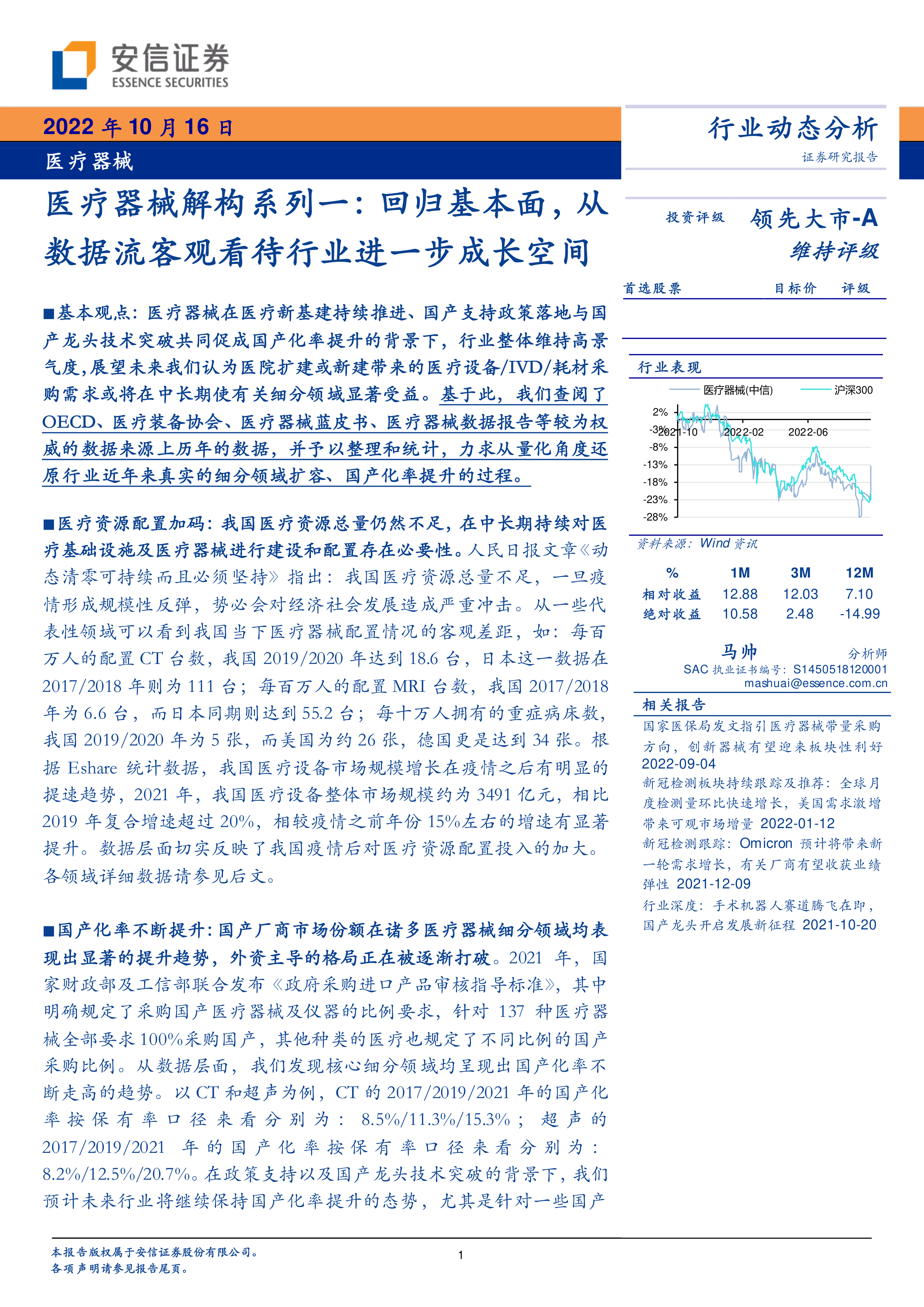 医疗资源配置加码:我国医疗资源总量仍然不足,在中长期持续对医疗基础设施及医疗器械进行建设和配置存在必要性。人民日报文章《动态清零可持续而且必须坚持》指出:我国医疗资源总量不足,一旦疫情形成规模性反弹,势必会对经济社会发展造成严重冲击。从一些代表性领域可以看到我国当下医疗器械配置情况的客观差距,如:每百万人的配置CT台数,我国2019/2020年达到18.6台,日本这一数据在2017/2018年则为111台;每百万人的配置MRI台数,我国2017/2018年为6.6台,而日本同期则达到55.2台;每十万人拥有的重症病床数,我国2019/2020年为5张,而美国为约26张,德国更是达到34张。根据Eshare统计数据,我国医疗设备市场规模增长在疫情之后有明显的提速趋势,2021年,我国医疗设备整体市场规模约为3491亿元,相比2019年复合增速超过20%,相较疫情之前年份15%左右的增速有显著提升。数据层面切实反映了我国疫情后对医疗资源配置投入的加大。各领域详细数据请参见后文。