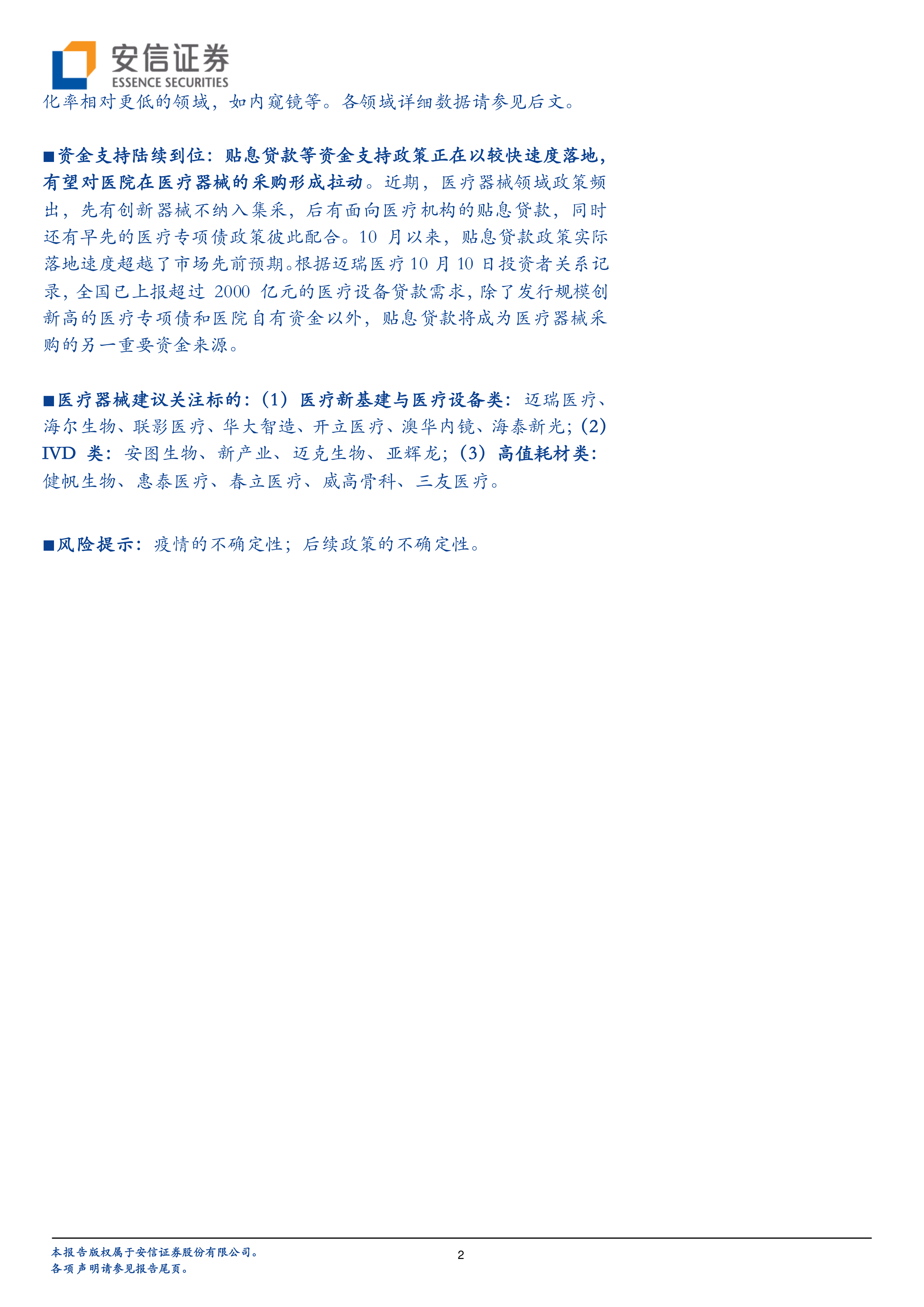 报告最后给出了建议关注的医疗器械标的,涵盖医疗新基建与医疗设备类、IVD类和高值耗材类,并列出了具体的公司名称。同时,报告也指出了疫情的不确定性和后续政策的不确定性等风险因素。