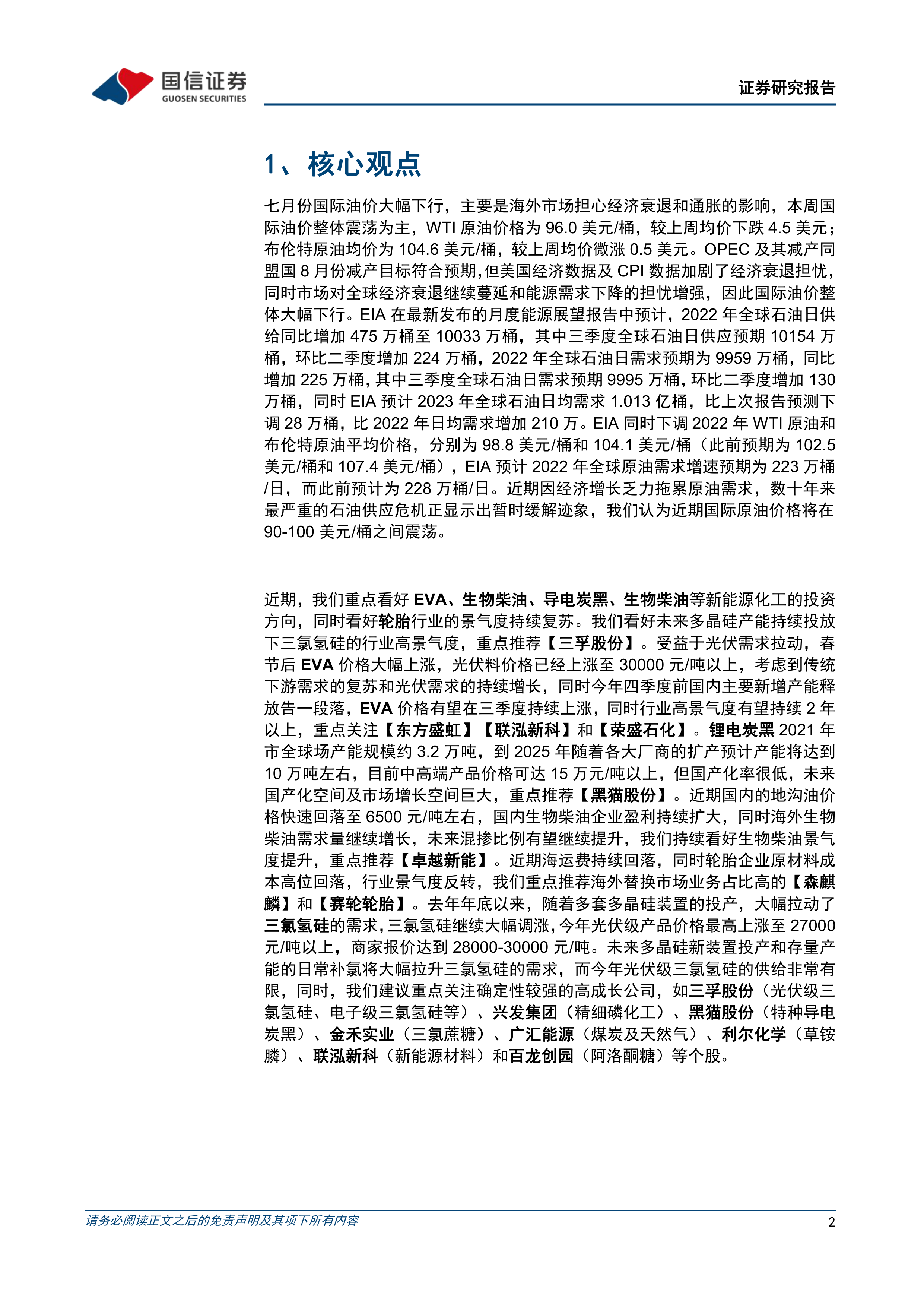 本报告的核心观点是:七月份国际油价大幅下跌,主要受海外经济衰退和通胀担忧影响。短期内,国际油价预计在90-100美元/桶区间震荡。基于此,报告超配基础化工行业,并看好EVA、轮胎、生物柴油等细分领域的投资方向,推荐相关个股。