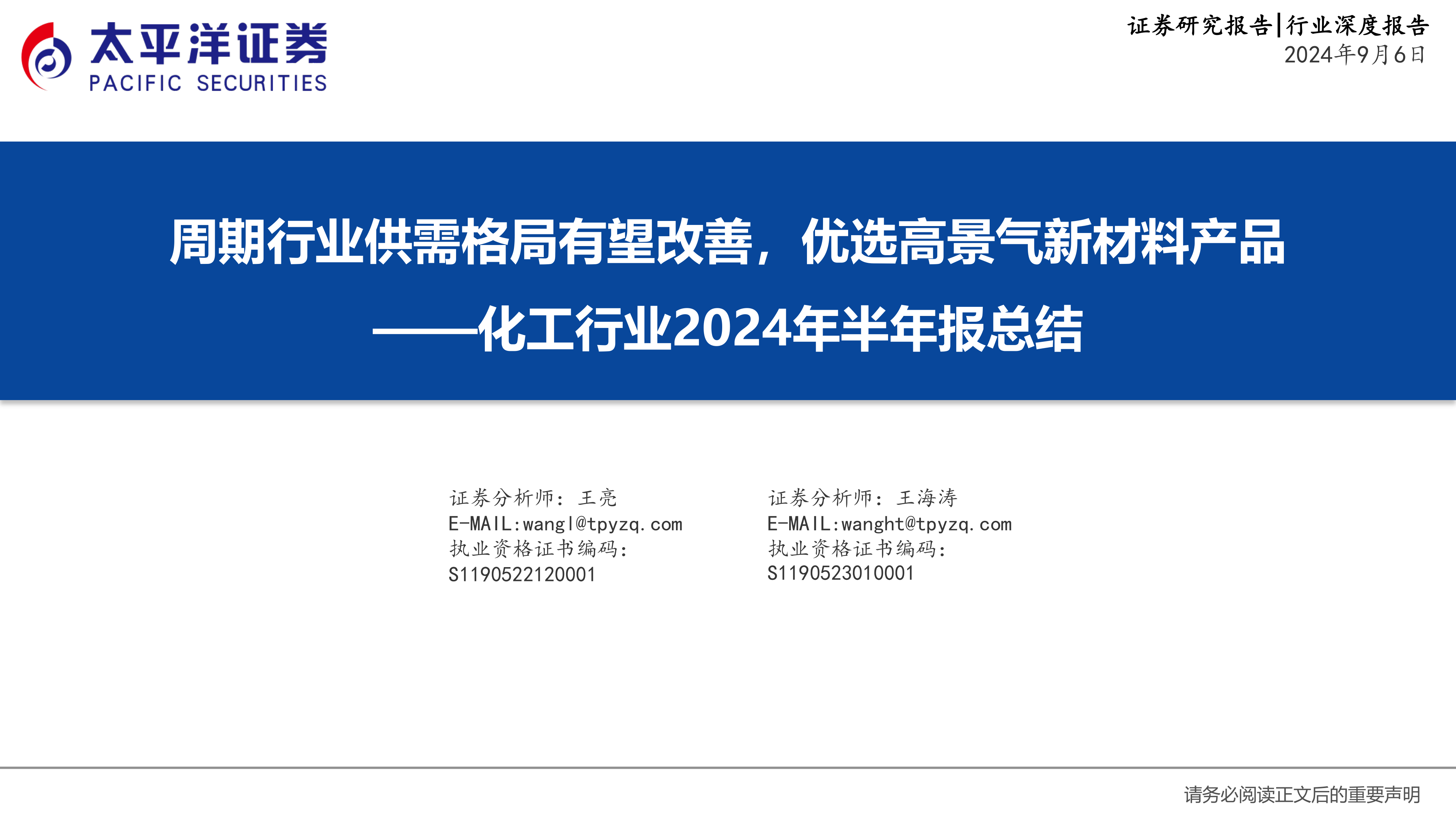 化工行业2024年半年报总结:周期行业供需格局有望改善,优选高景气新材料产品