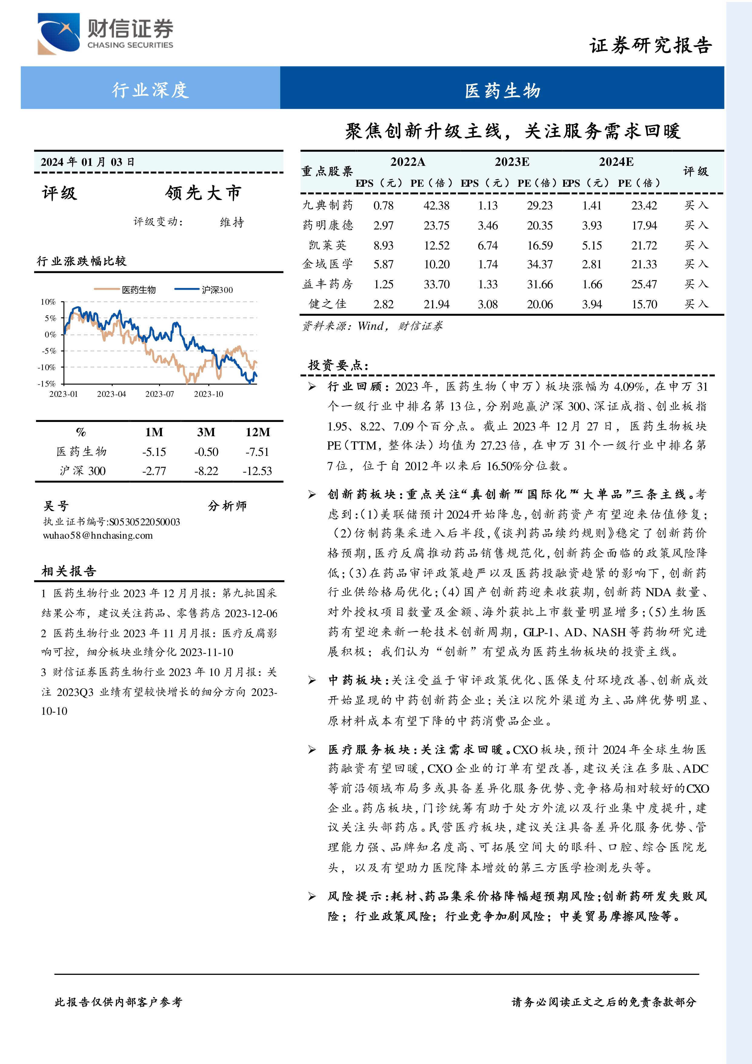 医药生物行业深度:聚焦创新升级主线,关注服务需求回暖
