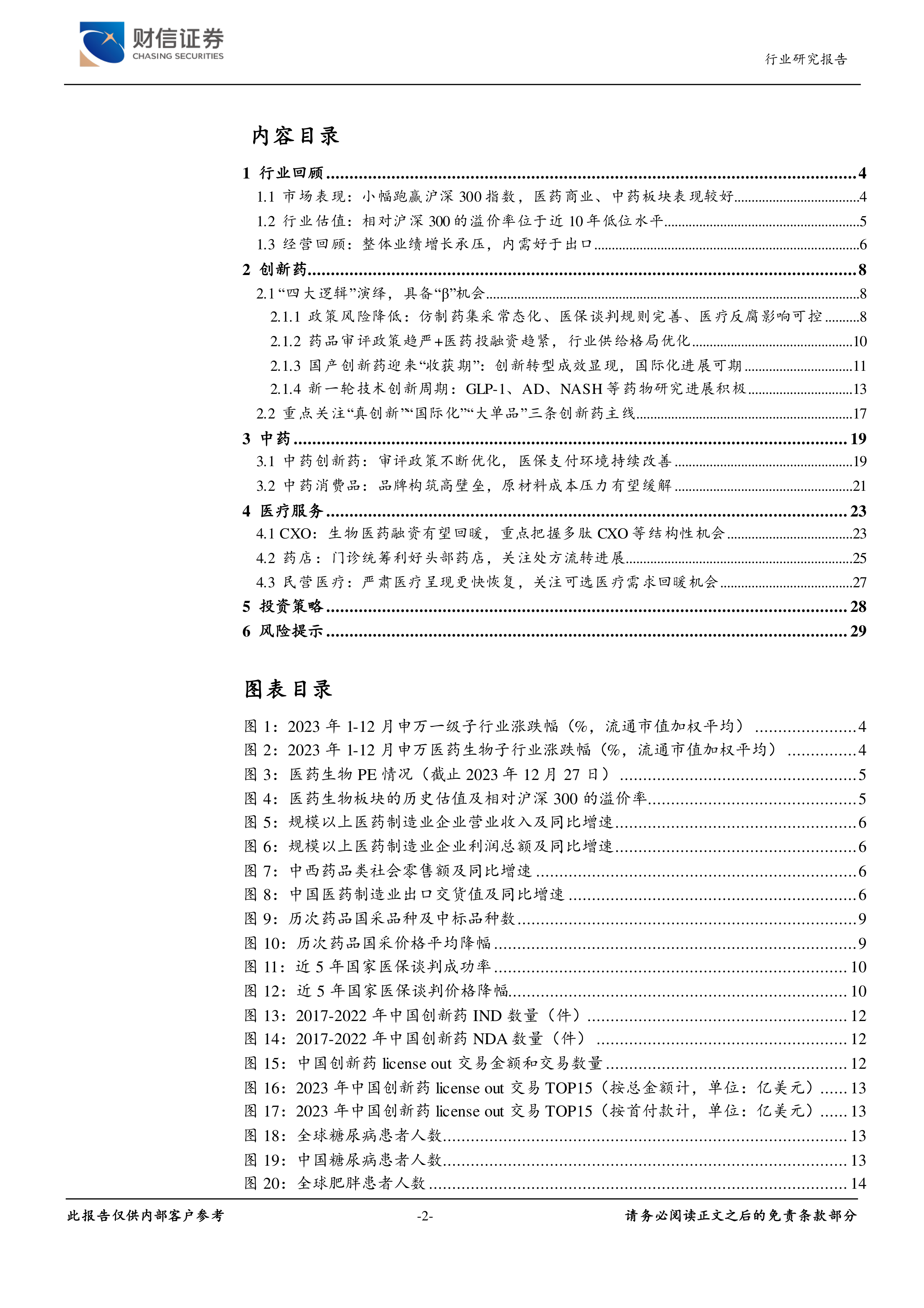 本报告的核心观点是:2023年医药生物板块表现略好于大盘,但整体业绩承压,估值处于历史低位。展望2024年,在政策风险降低、行业供给格局优化、创新药收获期到来以及新技术创新周期开启等多重因素驱动下,医药生物板块有望迎来复苏,具备较好的投资价值。建议关注创新药(尤其“真创新”、“国际化”、“大单品”)、中药(创新药和消费品)、以及医疗服务(CXO、药店、民营医院)等领域的投资机会。