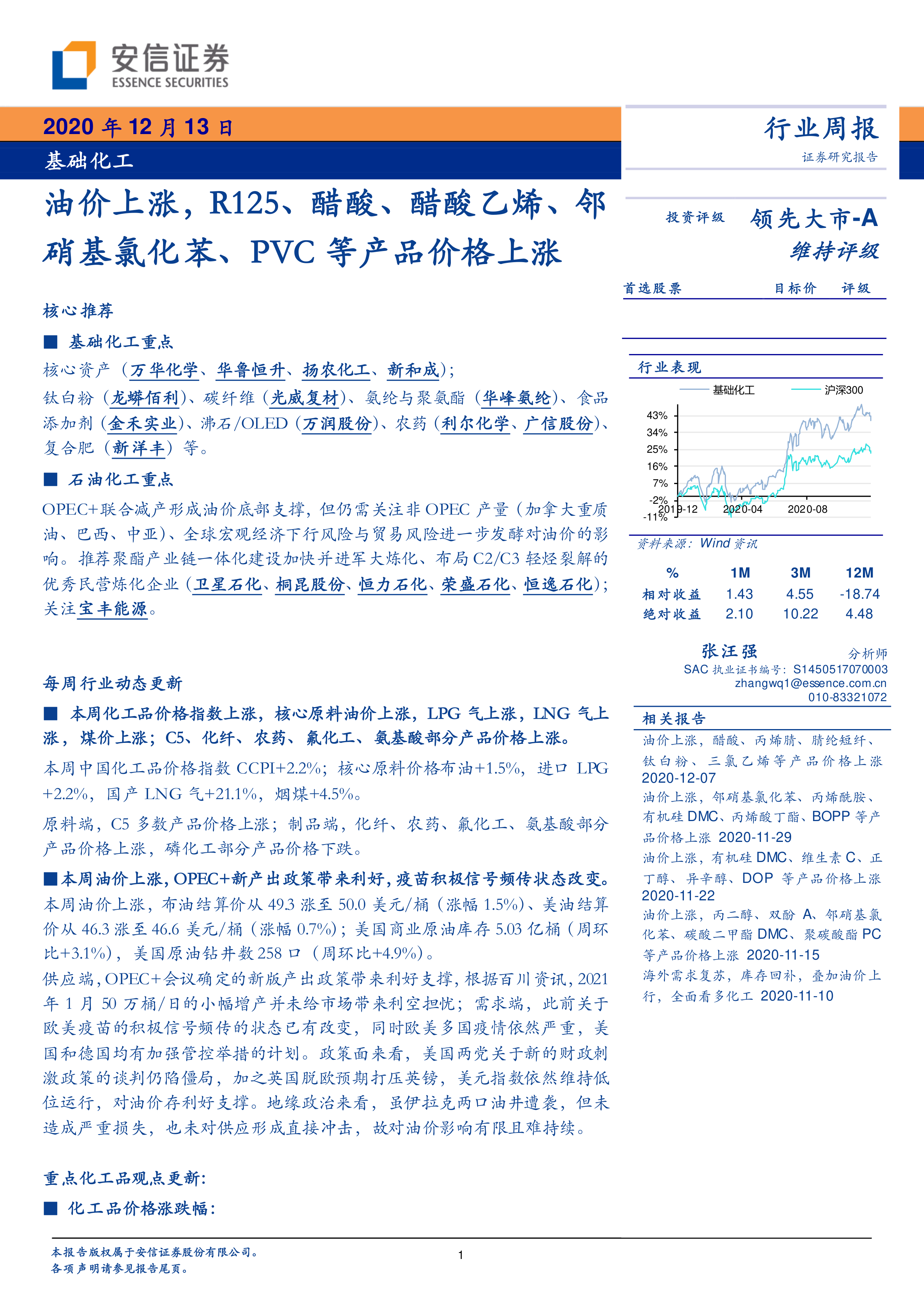 本报告的核心观点是:2020年12月13日,基础化工行业受油价上涨影响,多种化工产品价格上涨,市场呈现供不应求的局面。报告重点分析了R125、醋酸、醋酸乙烯、邻硝基氯化苯和PVC等产品的价格上涨原因,并对未来市场走势进行了预测。