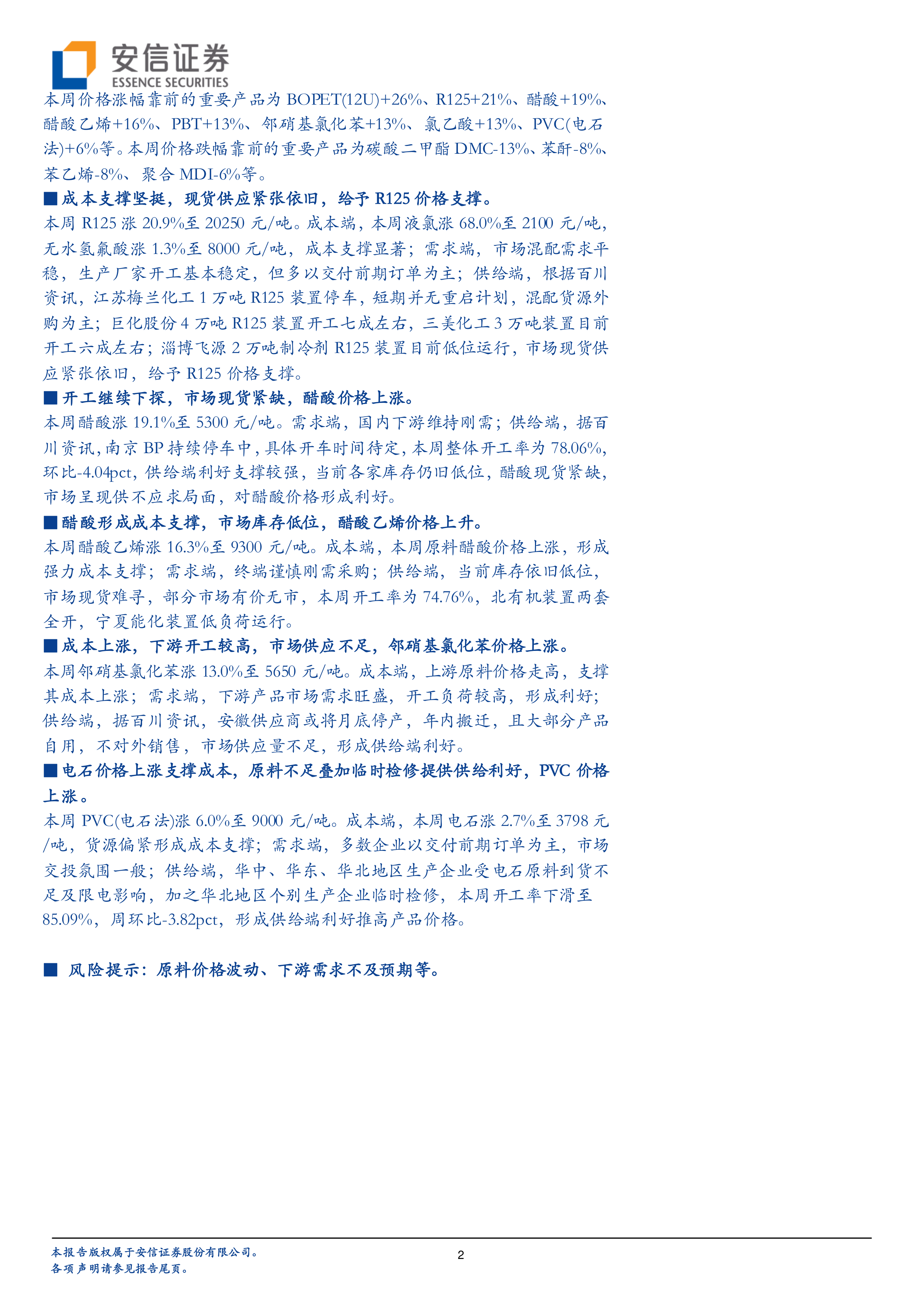 报告对R125、醋酸、醋酸乙烯、邻硝基氯化苯和PVC等几种主要化工产品价格上涨的原因进行了深入分析,从成本端、需求端和供给端三个方面进行了详细阐述,并结合具体企业生产情况和市场供需状况,解释了价格波动的内在逻辑。