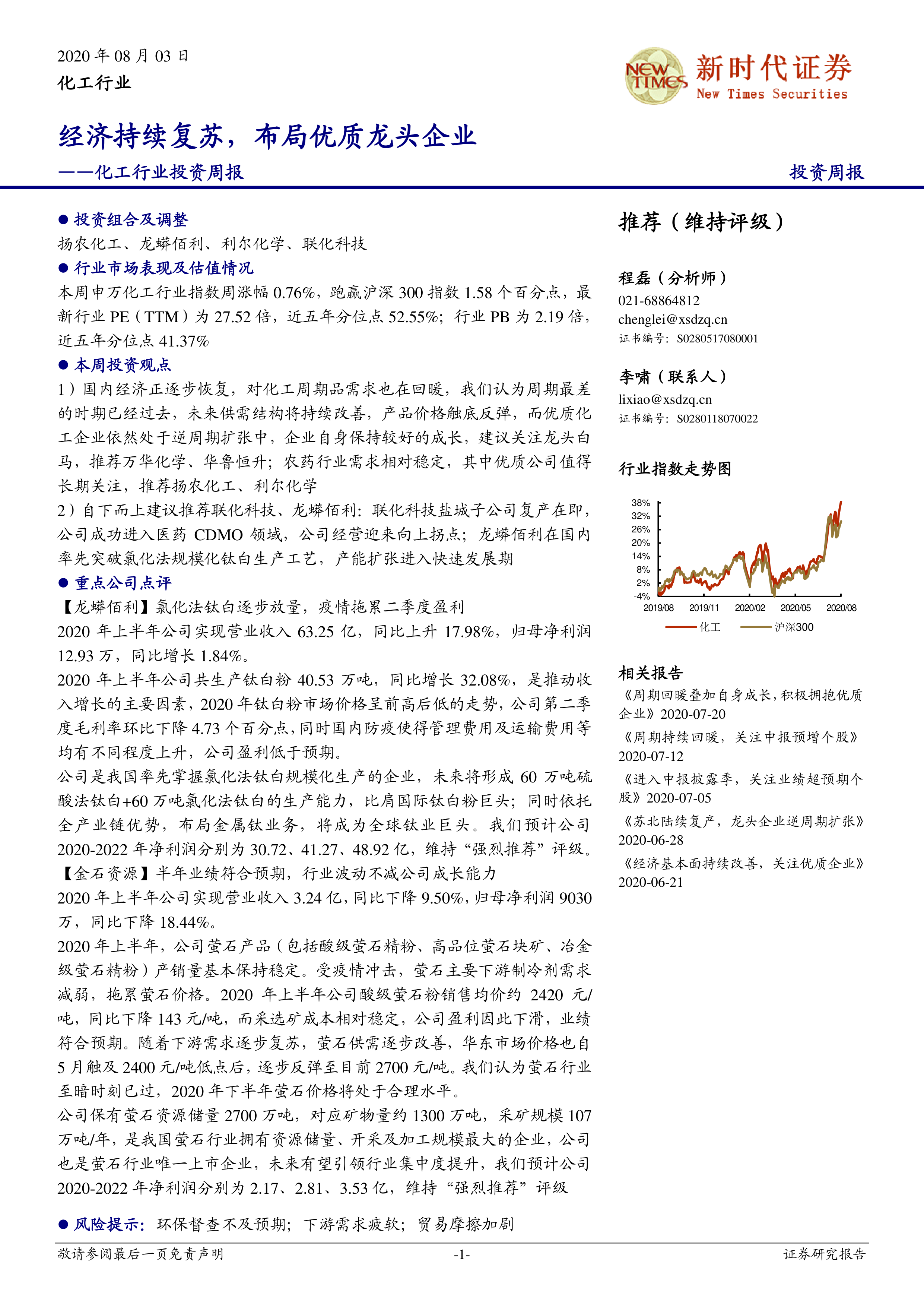 报告对龙蟒佰利和金石资源进行了重点点评,分析了其2020年上半年业绩表现,并对未来发展前景进行了预测和评级。龙蟒佰利受益于氯化法钛白产能扩张,但二季度盈利低于预期;金石资源业绩符合预期,但受萤石价格周期影响。两家公司均维持“强烈推荐”评级。