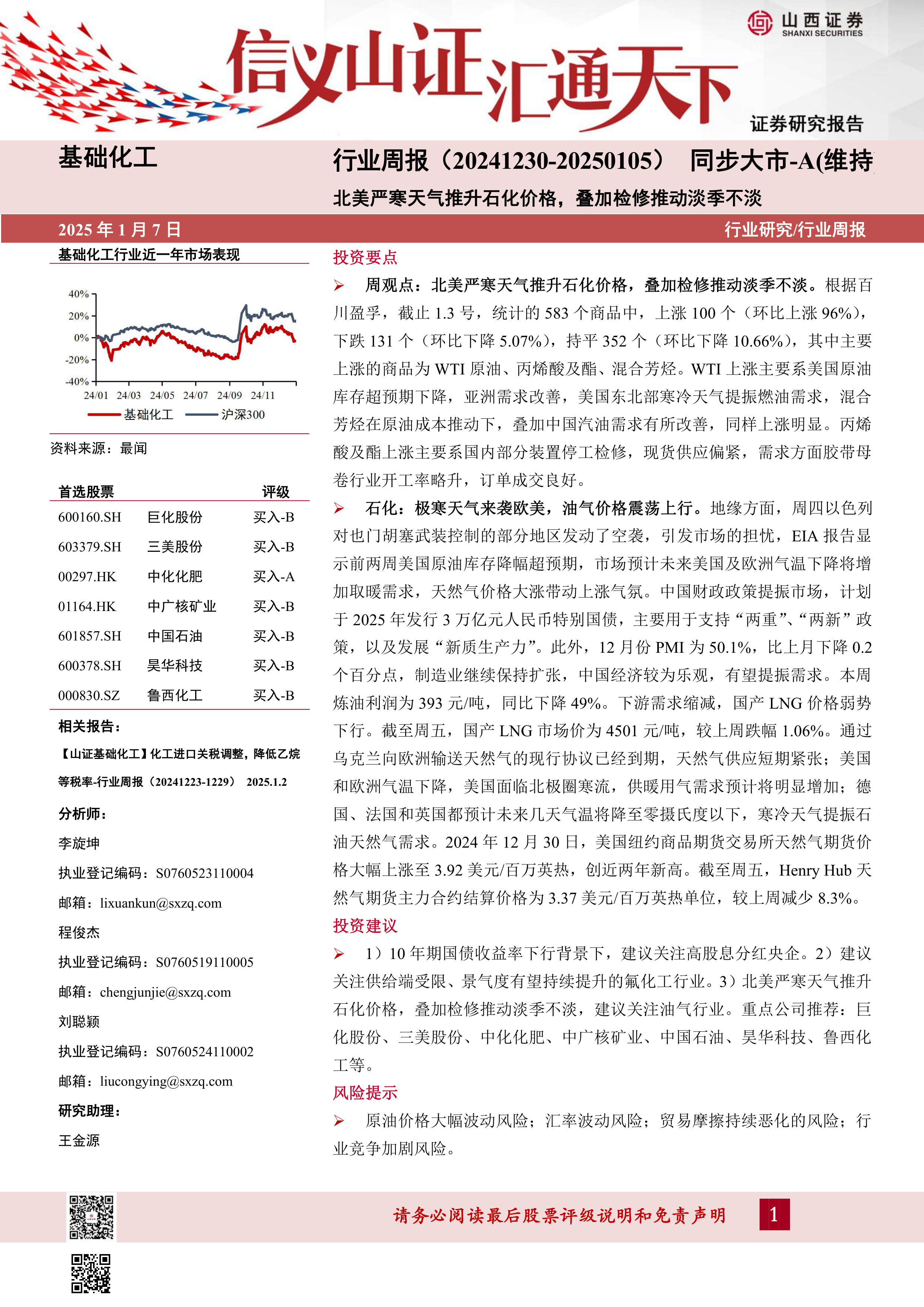 本报告基于百川盈孚等机构的数据,对2024年12月30日至2025年1月5日期间基础化工行业市场进行了分析。 北美严寒天气和中国经济因素共同作用下,化工市场表现出显著分化:部分商品价格上涨,但整体板块下跌。 报告建议投资者关注高股息分红央企、氟化工行业以及油气行业,并需谨慎应对原油价格波动、汇率波动、贸易摩擦和行业竞争加剧等风险。 报告数据翔实,分析客观,为投资者提供了有价值的参考信息。