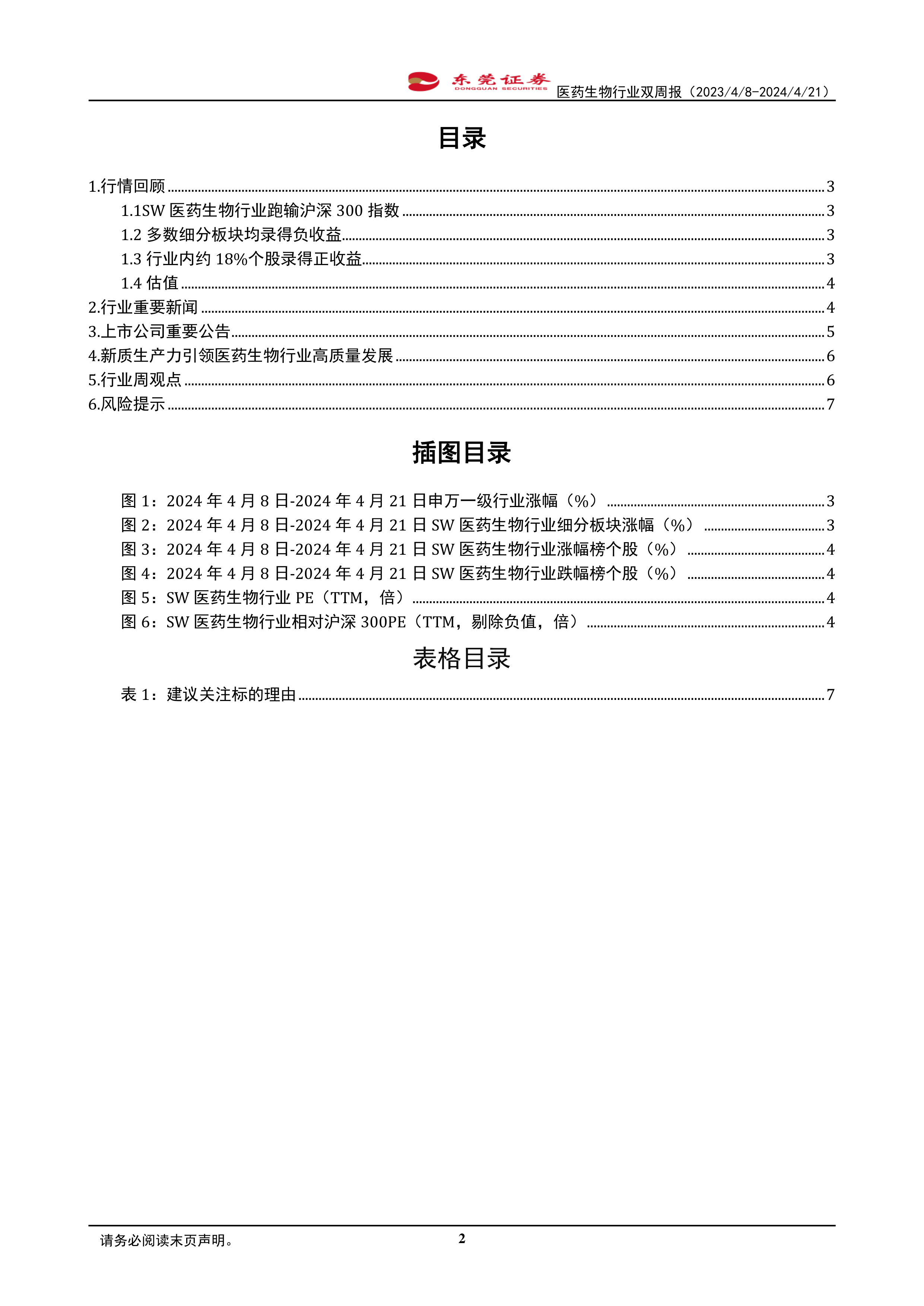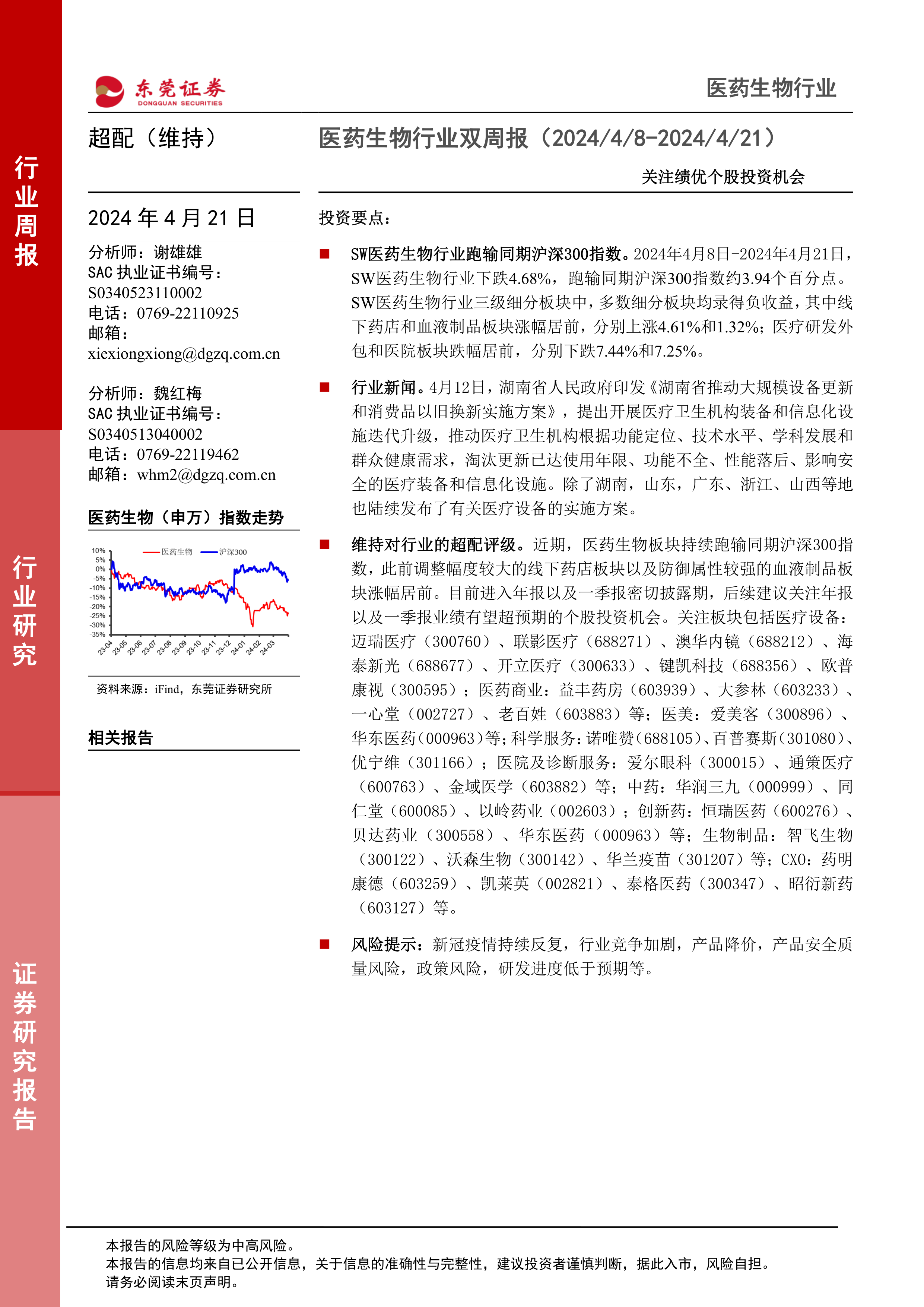 本报告对2024年4月8日至2024年4月21日期间SW医药生物行业进行了全面分析,指出行业整体表现弱于大盘,但细分板块表现分化,部分板块展现出一定的韧性。报告维持对行业的超配评级,并建议投资者关注业绩有望超预期的个股,同时需谨慎评估行业面临的多种风险。报告数据主要来自iFind和东莞证券研究所,投资者应谨慎判断,风险自担。 报告中提供的个股信息仅供参考,不构成投资建议。