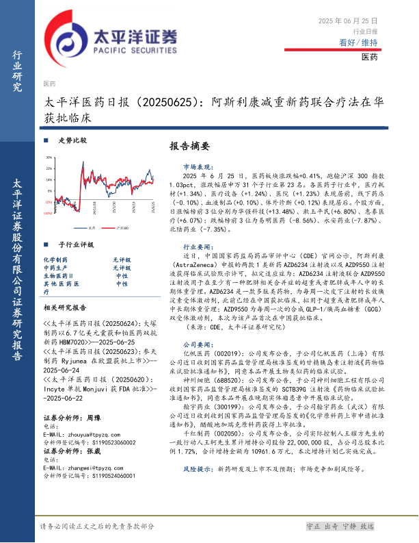 本报告的核心观点是:2025年6月25日,医药板块整体表现略高于市场平均水平,但个股表现分化明显。阿斯利康两款新药获批临床试验,为医药行业带来利好消息,但市场整体仍存在风险。