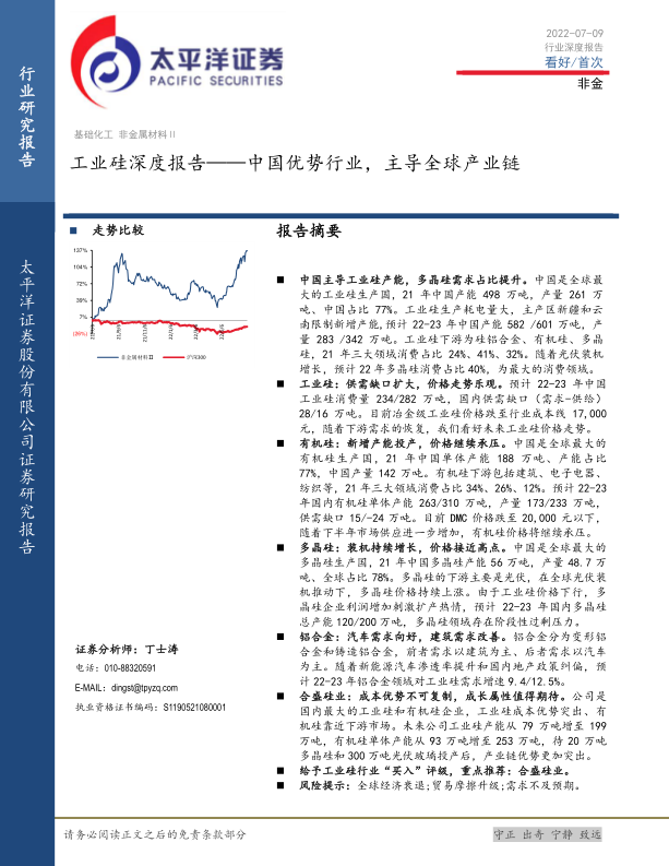 报告给予工业硅行业“买入”评级,重点推荐合盛硅业。但需关注全球经济衰退、贸易摩擦升级和需求不及预期等风险。