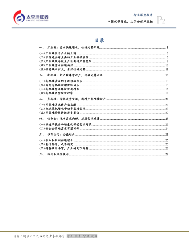 本报告对中国工业硅产业链进行了深入分析,指出中国在该产业链中占据主导地位,并预测未来几年工业硅行业前景乐观。报告详细分析了工业硅、有机硅、多晶硅和铝合金四个细分领域的市场供需情况和价格走势,并重点推荐了具有成本优势和产业链优势的合盛硅业。 报告也指出了潜在的风险因素,为投资者提供了全面的参考信息。