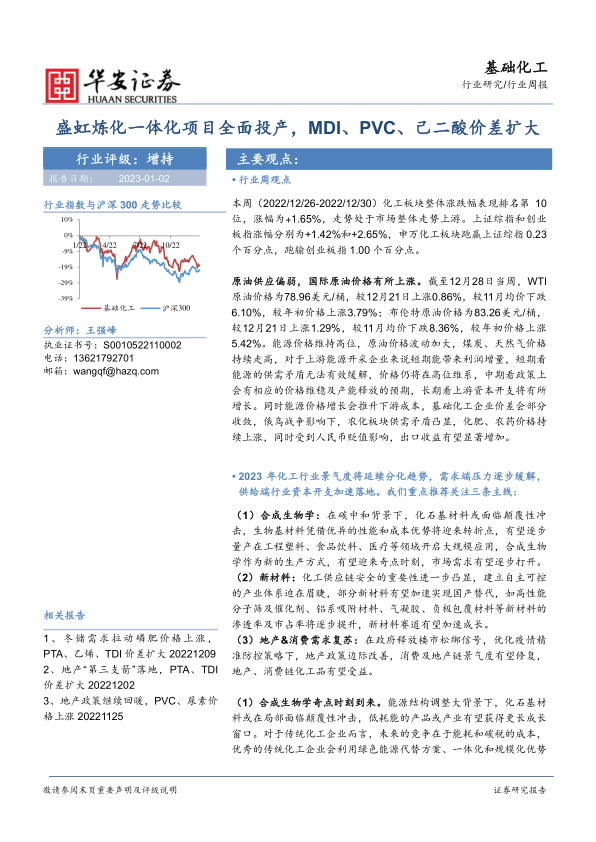 本报告对本周化工行业市场表现、重点行业产品价格及供给侧情况进行了全面分析,并对部分重点公司进行了跟踪。报告认为,2023年化工行业景气度将延续分化趋势,建议投资者关注合成生物学、新材料和地产&消费需求复苏三个投资主线,同时关注行业集中度提升趋势下的龙头企业。 报告也提示了政策扰动、技术扩散等多种潜在风险。 需要注意的是,报告中的信息和观点仅供参考,不构成投资建议。