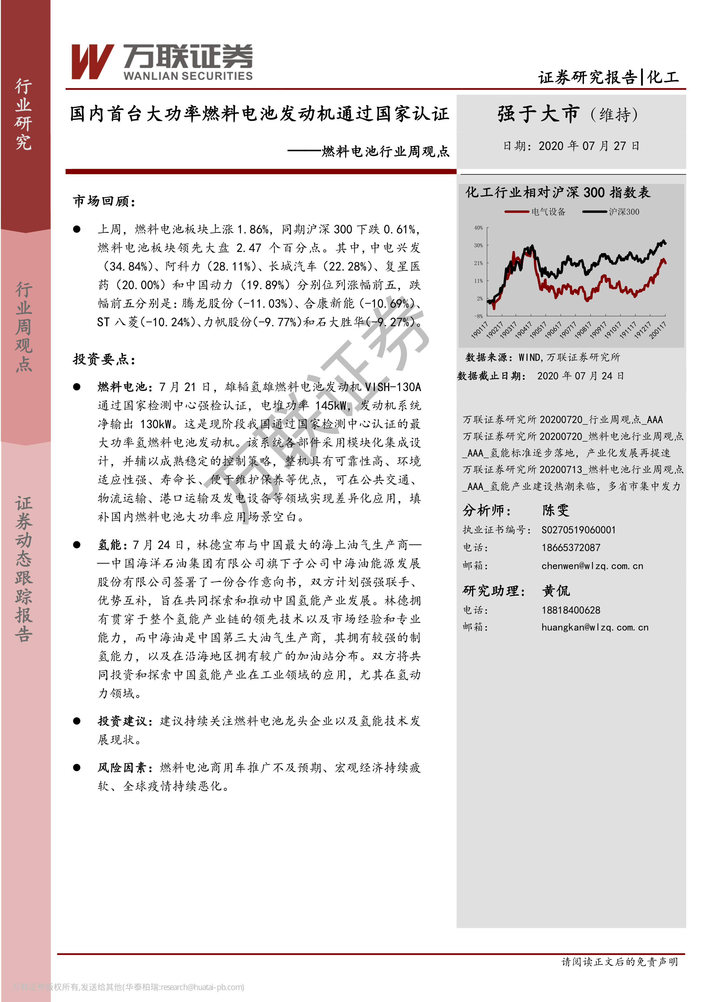 本报告详细分析了2020年7月20日至27日期间燃料电池行业的市场表现、行业热点事件以及投资建议。