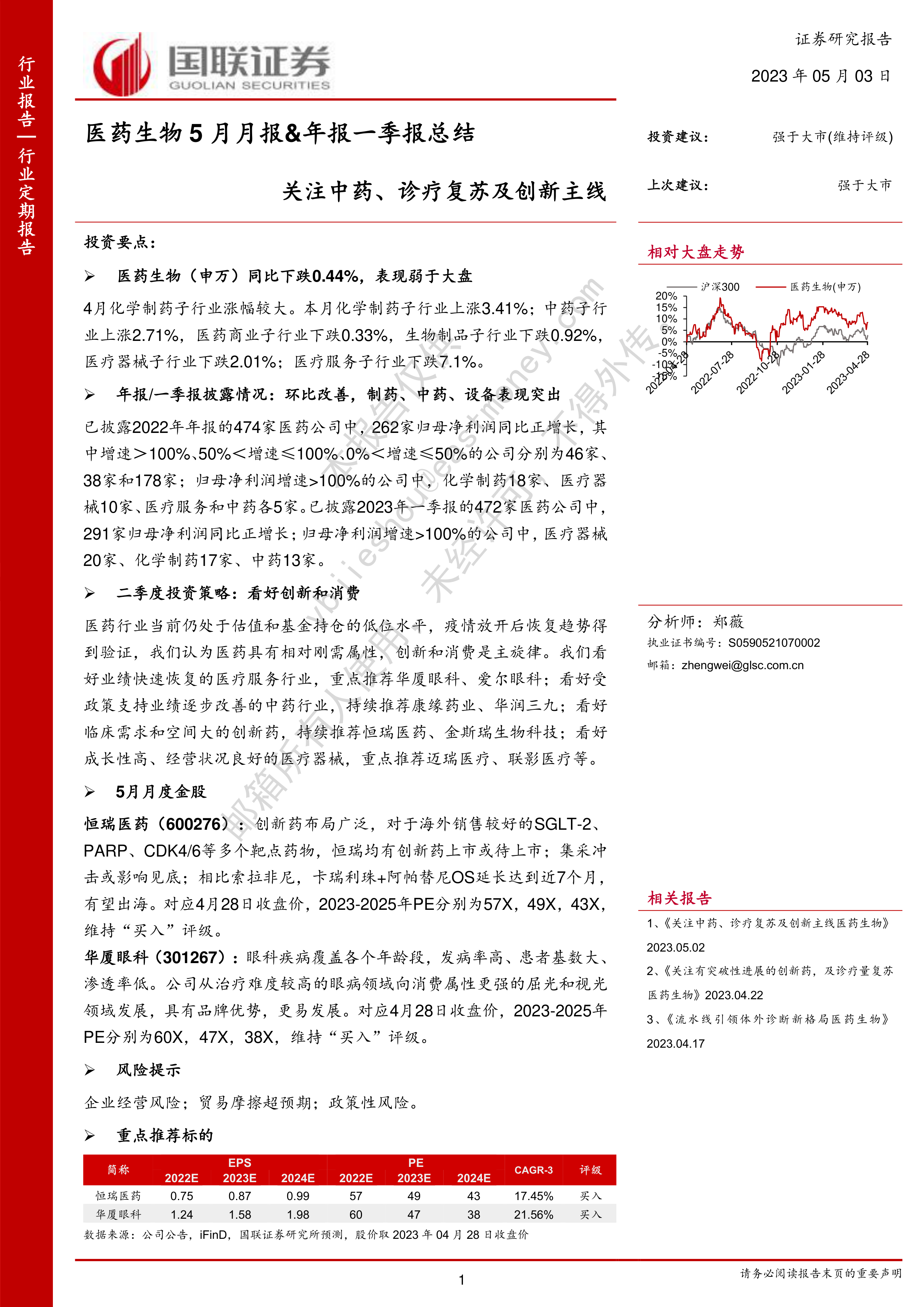 恒瑞医药(600276):创新药布局广泛,对于海外销售较好的SGLT-2、PARP、CDK4/6等多个靶点药物,恒瑞均有创新药上市或待上市;集采冲击或影响见底;相比索拉非尼,卡瑞利珠+阿帕替尼OS延长达到近7个月,有望出海。对应4月28日收盘价,2023-2025年PE分别为57X,49X,43X,维持“买入”评级。