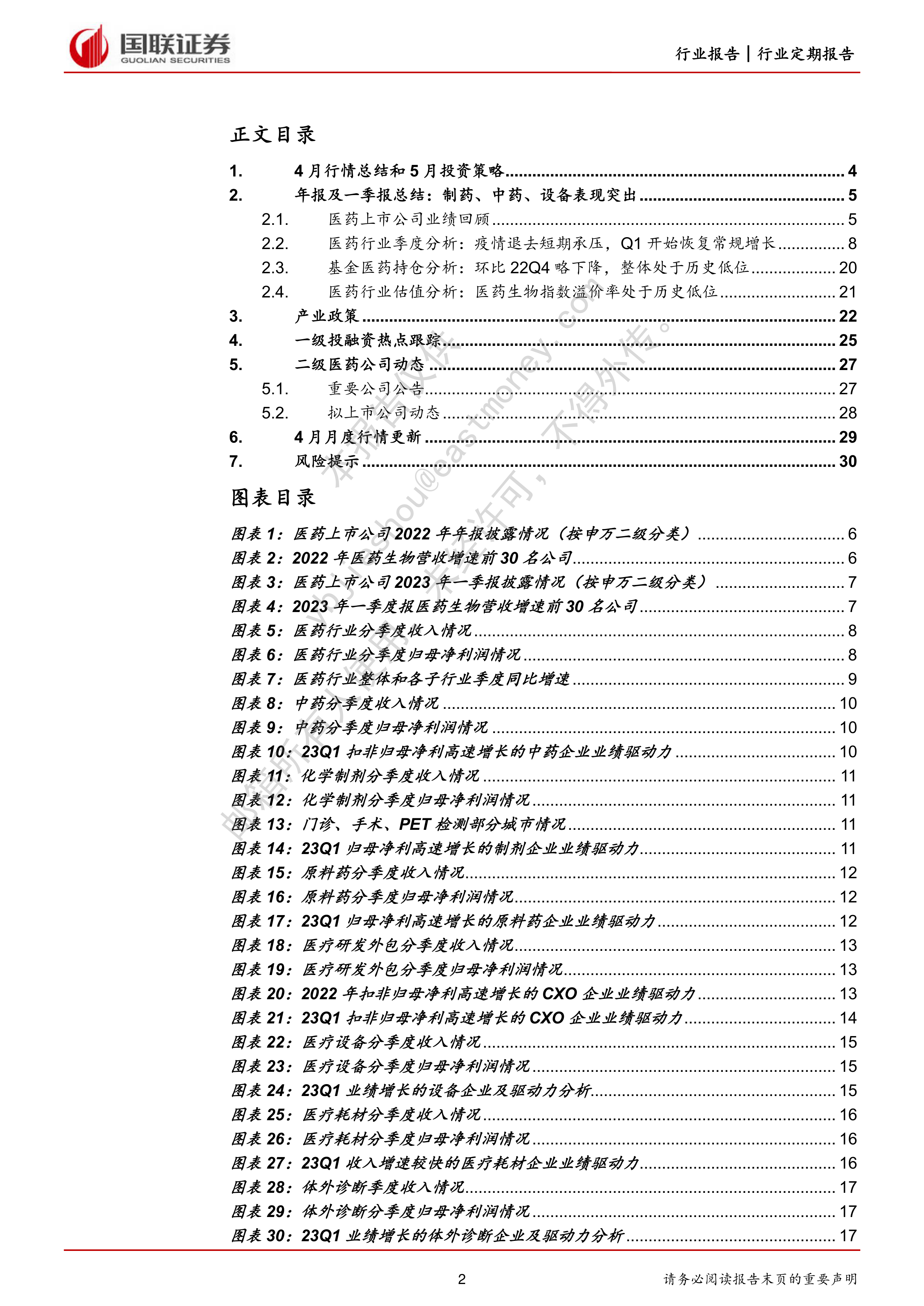 本报告详细分析了2023年5月医药生物行业市场情况,并对未来投资策略进行了展望。报告内容涵盖了4月行情总结、年报及一季报总结、产业政策、一级投融资热点跟踪、二级医药公司动态以及风险提示等多个方面。