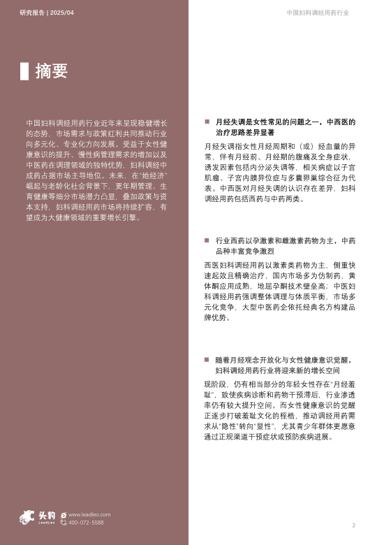 本报告的核心观点是:中国妇科调经用药行业正处于稳健增长阶段,市场规模持续扩大,这主要得益于“她经济”的崛起、女性健康意识的提升以及国家政策的支持。未来,更年期管理、生育健康等细分市场潜力巨大,行业发展前景广阔。然而,行业也面临着原料价格上涨、竞争加剧以及“月经羞耻”文化的影响等挑战。