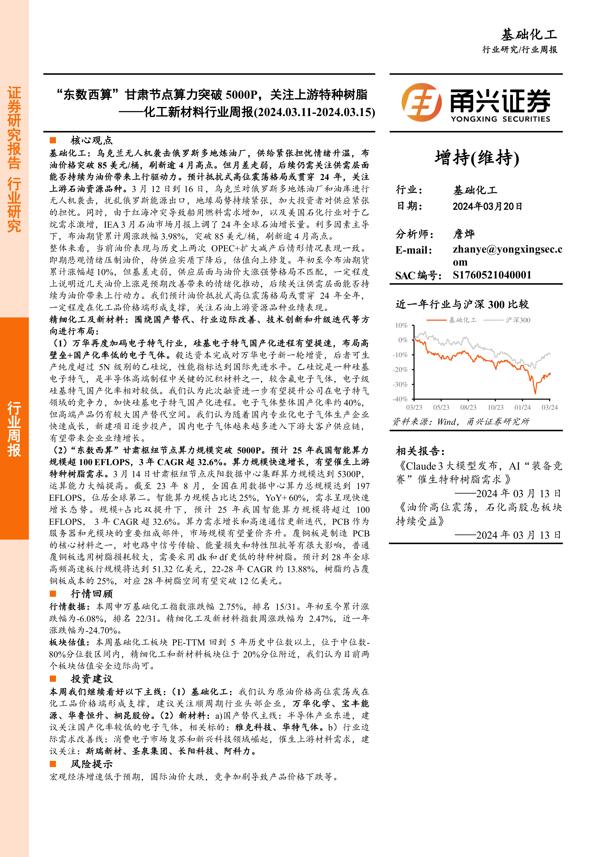 化工新材料行业周报:“东数西算”甘肃节点算力突破5000P,关注上游特种树脂